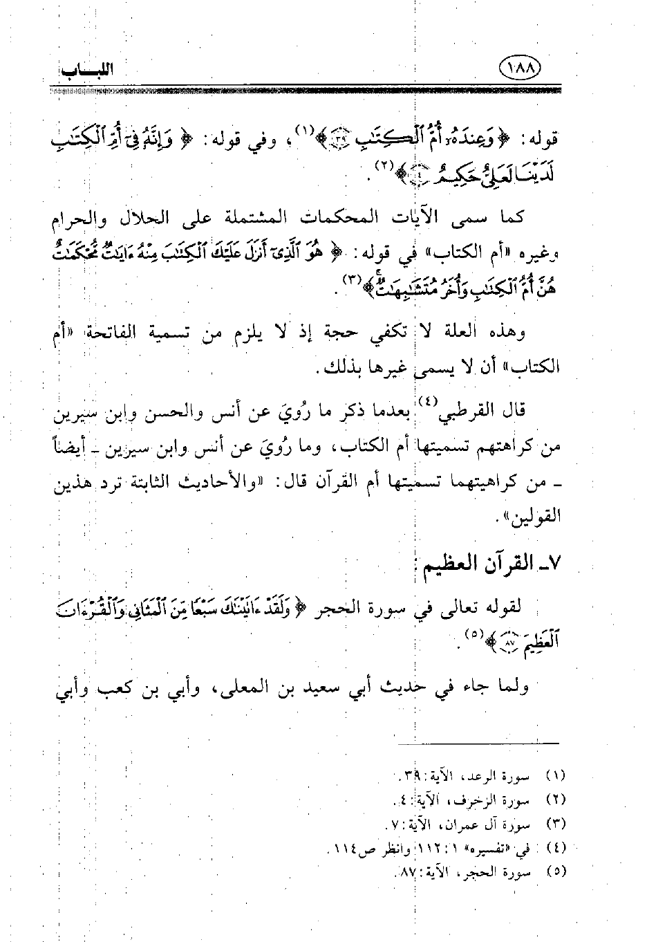 وهذه العلة لا تكفي حجة إذ لا يلزم من تسمية الفاتحة «أم الكتاب» أن لا يسمى غيرها بذلك.