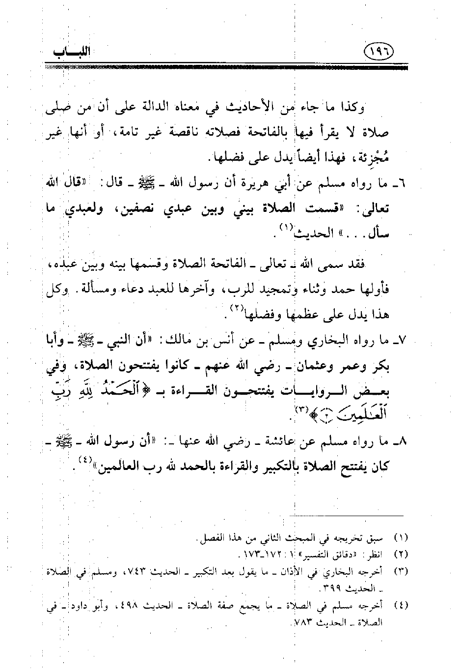 7 - ما رواه البخاري ومسلم - عن أنس بن مالك - رضي الله عنه -: «أن النبي - صلى الله عليه وسلم - وأبا بكر وعمر وعثمان -رضي عنهم- كانوا يفتتحون الصلاة, وفي بعض الروايات يفتتحون القراءة بـ {الْحَمْدُ لِلَّهِ رَبِّ الْعَالَمِين} (¬3).