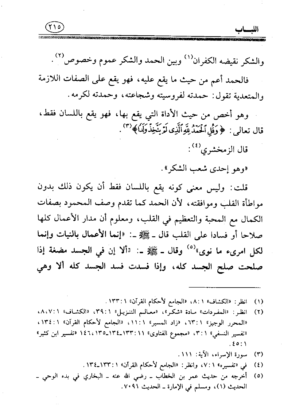 (¬2) انظر: «المفردات» مادة «شكر»، «معالم التنزيل» 1: 39، «الكشاف» 1: 7، 8، «المحرر الوجيز» 1: 63، «زاد المسير» 1: 11، «الجامع لأحكام القرآن» 1: 134، «تفسير النسفي» 1: 3، «مجموع الفتاوى» 11: 133 - 134 - 135، 146 «تفسير ابن كثير» 1: 45.