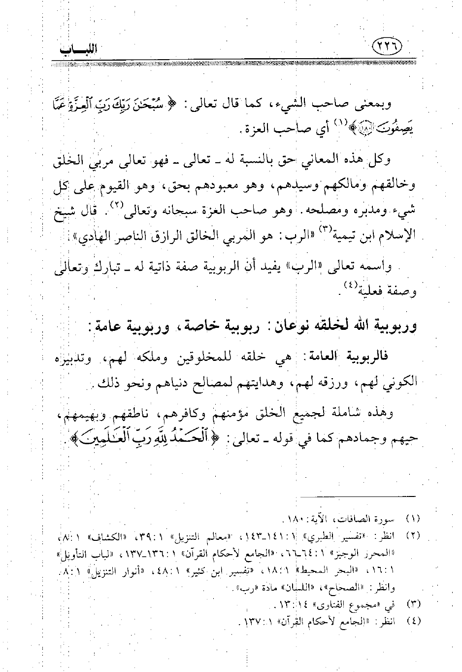 (¬2) انظر: «تفسير الطبري» 1: 141 - 143، «معالم التنزيل» 1: 39، «الكشاف» 1: 8، «المحرر الوجيز» 1: 64 - 66، «الجامع لأحكام القرآن» 1: 136 - 137، «لباب التأويل» 1: 16، «البحر المحيط» 1: 18، «تفسير ابن كثير» 1: 48، «أنوار التنزيل» 1: 8، وانظر: «الصحاح»، «اللسان» مادة «رب».