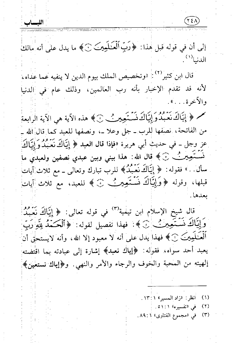 قال شيخ الإسلام ابن تيمية (¬3) في قوله تعالى: {إِيَّاكَ نَعْبُدُ وَإِيَّاكَ نَسْتَعِينُ}: فهذا تفصيل لقوله: {الْحَمْدُ لِلَّهِ رَبِّ الْعَالَمِينَ} فهذا يدل على أنه لا معبود إلا الله، وأنه لا يستحق أن يعبد أحد سواه، فقوله: {إِيَّاكَ نَعْبُدُ} إشارة إلى عبادته بما اقتضته إلهيته من المحبة والخوف والرجاء والأمر والنهي. {وَإِيَّاكَ نَسْتَعِينُ}