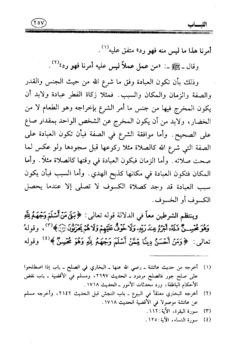 وينتظم الشرطين معًا في الدلالة قوله تعالى: {بَلَى مَنْ أَسْلَمَ وَجْهَهُ لِلَّهِ وَهُوَ مُحْسِنٌ فَلَهُ أَجْرُهُ عِنْدَ رَبِّهِ وَلَا خَوْفٌ عليهِمْ وَلَا هُمْ يَحْزَنُونَ} (¬3)، وقوله تعالى: {وَمَنْ أَحْسَنُ دِينًا مِمَّنْ أَسْلَمَ وَجْهَهُ لِلَّهِ وَهُوَ مُحْسِنٌ} (¬4) وقوله