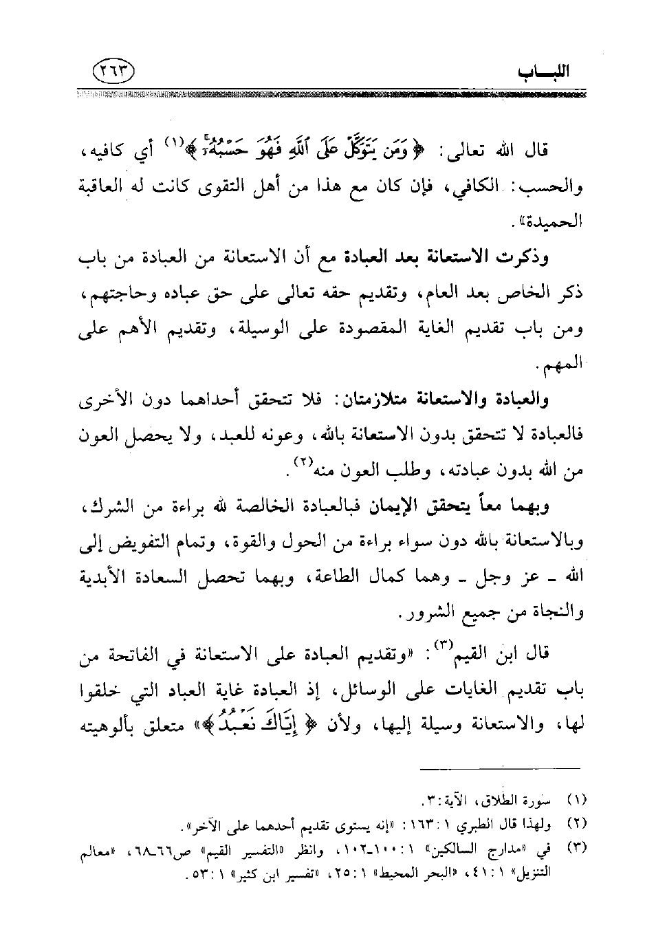 وبهما معًا يتحقق الإيمان فبالعبادة الخالصة لله براءة من الشرك، وبالاستعانة بالله دون سواء براءة من الحول والقوة، وتمام التفويض إلى الله - عز وجل - وهما كمال الطاعة وبهما تحصل السعادة الأبدية والنجاة من جميع الشرور.