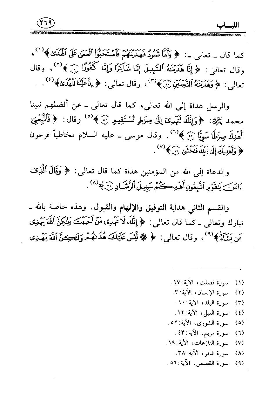 والقسم الثاني هداية التوفيق والإلهام والقبول. وهذه خاصة بالله - تبارك وتعالى - كما قال تعالى: {إِنَّكَ لَا تَهْدِي مَنْ أَحْبَبْتَ وَلَكِنَّ اللَّهَ يَهْدِي مَنْ يَشَاءُ} (¬9)، وقال تعالى: {لَيْسَ عليكَ هُدَاهُمْ وَلَكِنَّ اللَّهَ يَهْدِي