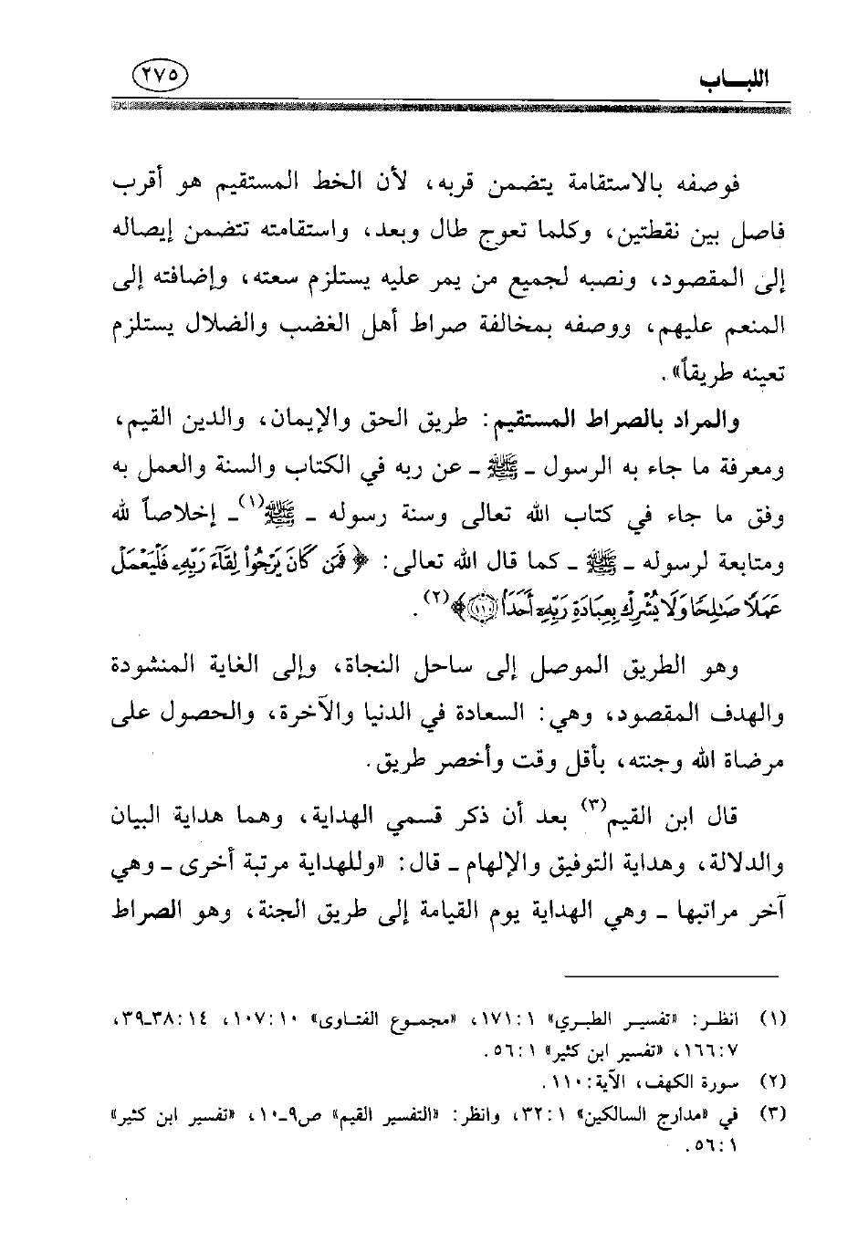 فوصفه بالاستقامة يتضمن قربه, لأن الخط المستقيم هو اقرب فاصل بين نقطتين, وكلما تعوج طال وبعد, واستقامته تتضمن إيصاله إلى المقصود, ونصبة لجميع من يمر عليه يستلزم سعته, وإضافته إلى المنعم عليهم , ووصفة بمخالفة صراط أهل الغضب والضلال يستلزم تعينه طريقًا».