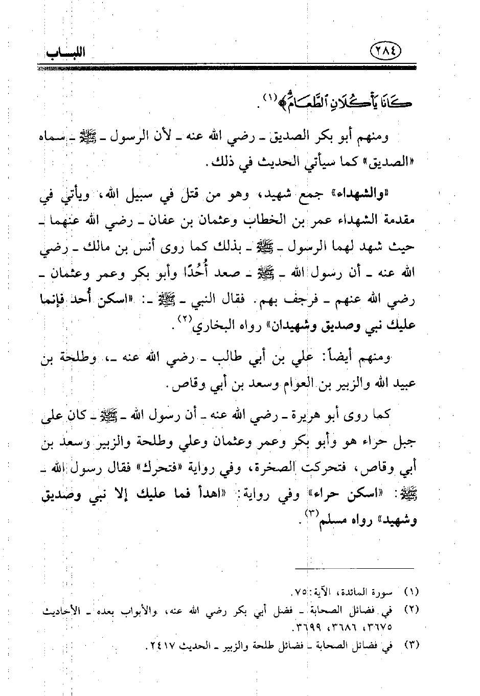 كما روى أبو هريرة - رضي الله عنه - أن رسول الله - صلى الله عليه وسلم - كان على جبل حراء هو أبو بكر وعمر وعثمان وعلى وطلحة والزبير وسعد بن أبي وقاص, فتحركت الصخرة, وفي رواية «فتحرك» فقال رسول الله - صلى الله عليه وسلم - «اسكن حراء» وفي رواية: «اهدأ فما عليك إلا نبيُّ وصدِّيق وشهيد» رواه مسلم (¬3).