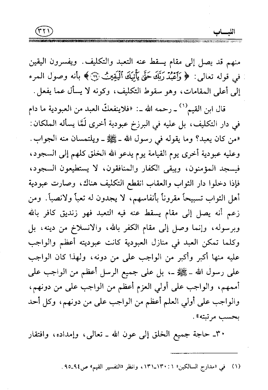 قال ابن القيم (¬1).-رحمه الله-» فلا ينفعك العبد من العبودية ما دام في دار التكليف، بل عليه في البرزخ عبودية أخرى لمَّا يسأله الملكان: "من كان يعبد؟ وما يقوله في رسول الله - صلى الله عليه وسلم - ويلتمسان من الجواب". وعليه عبودية أخرى يوم القيامة يوم يدعو الله الخلق كلهم إلى السجود، فيسجد المؤمنون، ويبقى الكفار والمنافقون، لا يستطيعون السجود فإذا دخلوا دار الثواب والعقاب أنقطع التكليف هناك، وصارت عبودية أهل الثواب تسبيحًا مقرونًا بأنفسهم، لا يجدون له تعبًا ولا نصبًا. ومن زعم أنه يصل إلى مقام يسقط عنه فيه التعبد فهو زنديق كافر بالله وبرسوله، وإنما وصل إلى مقام الكفر بالله، والانسلاخ من دينه، بل وكلما تمكن العبد في منازل العبودية كانت عبوديته أعظم والواجب عليه منها أكبر وأكبر من الواجب على من دونه، ولهذا كان الواجب على رسول الله - صلى الله عليه وسلم - بل على جميع الرسل أعظم من الواجب على أممهم, والواجب على أولي العزم أعظم من الواجب على من دونهم، والواجب على أولى العلم أعظم من الواجب على من دونهم، وكل أحد بحسب مرتبته».