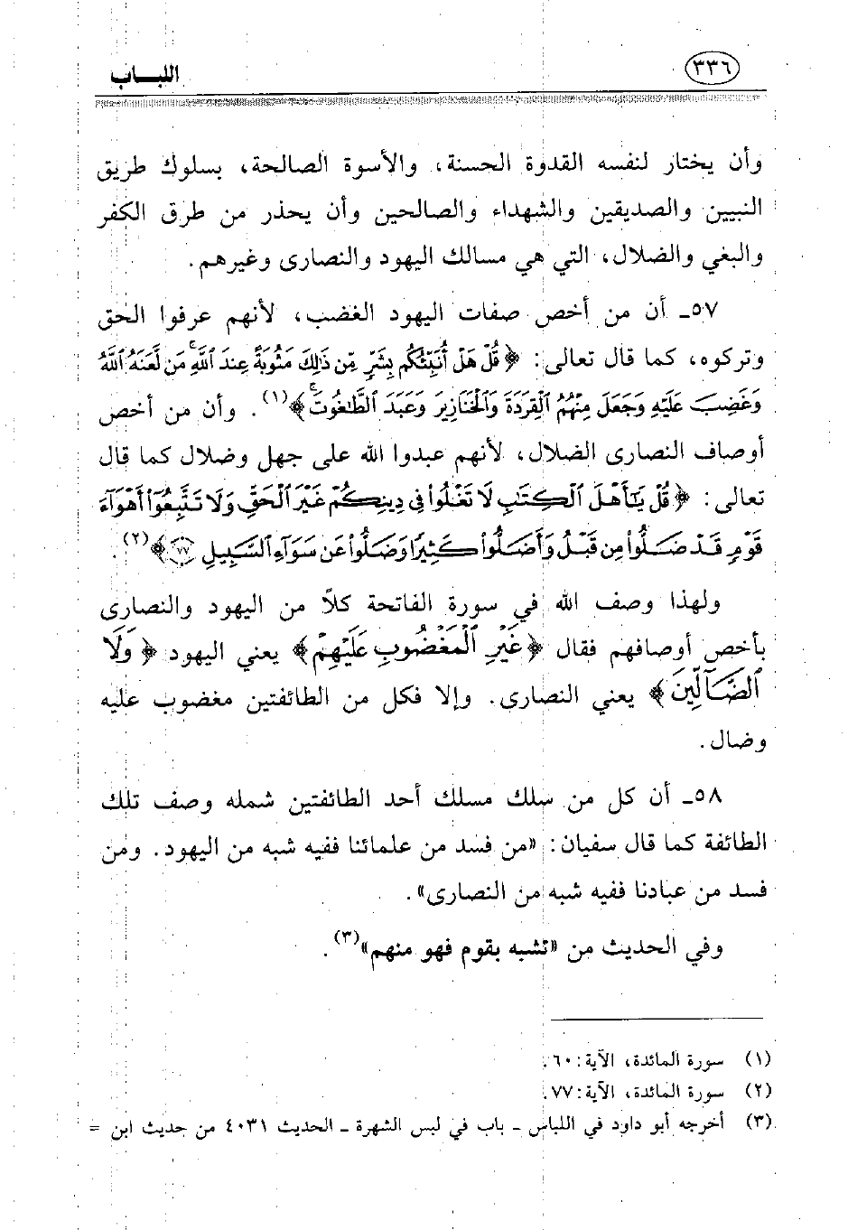 58 - أن كل من سلك مسلك أحد الطائفتين شمله وصف تلك الطائفة كما قال سفيان: «من فسد من علمائنا ففيه شبه من اليهود. ومن فسد من عبادنا ففيه شبه من النصارى».