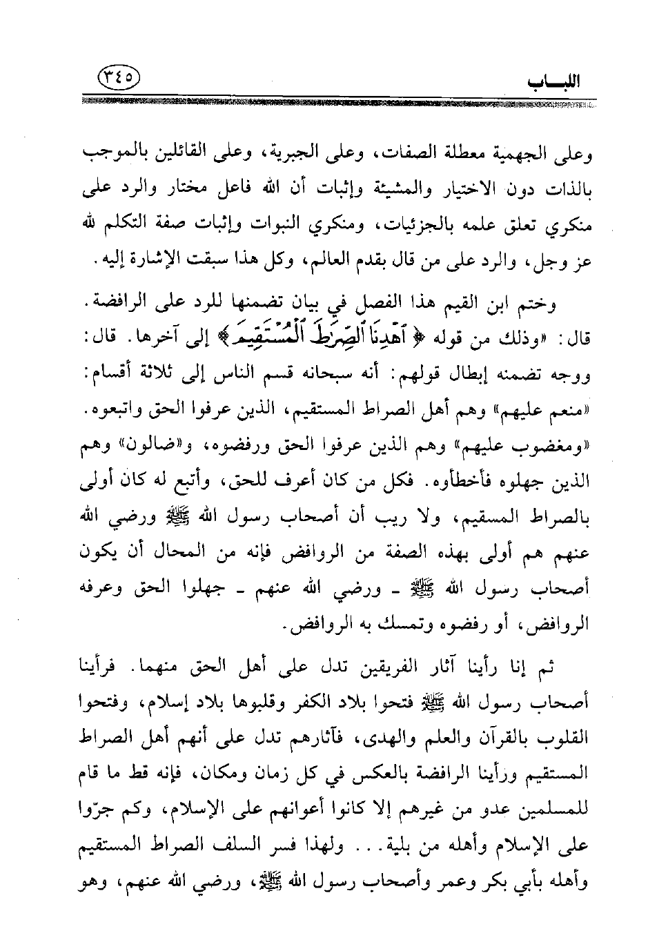 وختم ابن القيم هذا الفصل في بيان تضمنها للرد على الرافضة. قال: «وذلك من قوله {اهْدِنَا الصِّرَاطَ الْمُسْتَقِيمَ} إلى آخرها. قال: ووجه تضمنه إبطال قولهم: أنه سبحانه قسم الناس إلى ثلاثة أقسام: «منعم عليهم» وهم أهل الصراط المستقيم، الذين عرفوا الحق واتبعوه. «ومغضوب عليهم» وهم الذين عرفوا الحق ورفضوه، و «ضالون» وهم الذين جهلوه فأخطأوه. فكل من كان أعرف للحق، وأتبع له كان أولى بالصراط المستقيم، ولا ريب أن أصحاب رسول الله - صلى الله عليه وسلم - ورضي الله عنهم هم أولى بهذه الصفة من الروافض فإنه من المحال أن يكون أصحاب رسول الله - صلى الله عليه وسلم - ورضي الله عنهم - جهلوا الحق وعرفه الروافض، أو رفضوه وتمسك به الروافض.