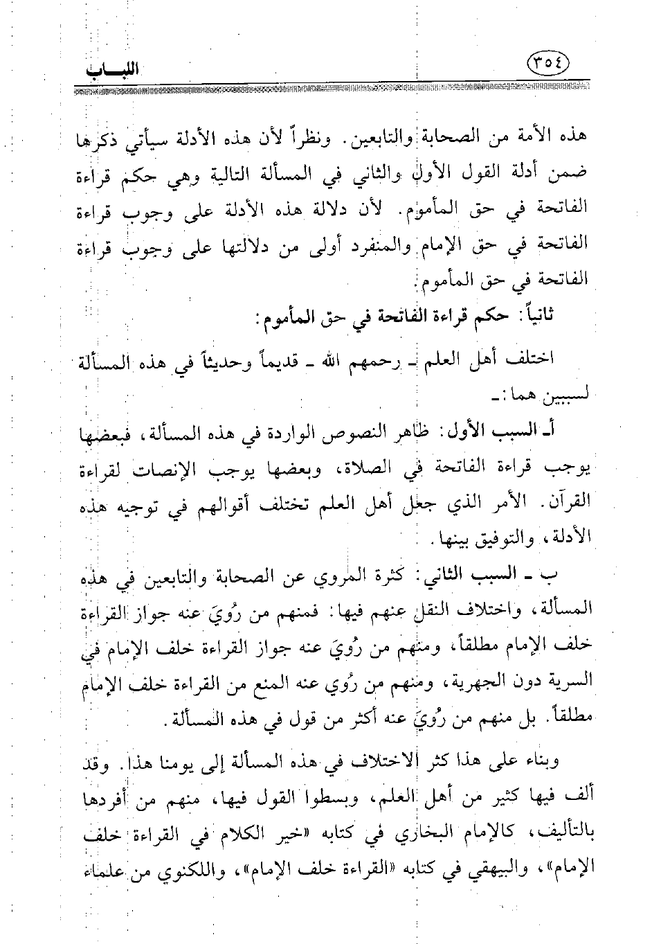 هذه الأمة من الصحابة والتابعين. ونظرًا لأن هذه الأدلة سيأتي ذكرها ضمن أدلة القول الأول والثاني في المسألة التالية وهي حكم قراءة الفاتحة في حق المأموم. لأن دلالة هذه الأدلة على وجوب قراءة الفاتحة في حق الإمام والمنفرد أولى من دلالتها على وجوب قراءة الفاتحة في حق المأموم.