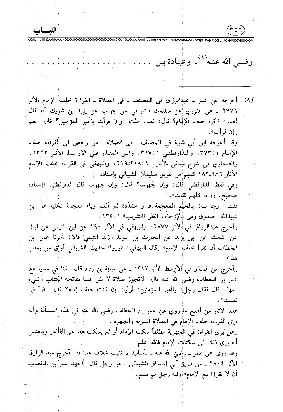 وقد حمل ابن عبد البر في «التمهيد» 11: 35 ما رواه يزيد بن شريك عن عمر على القراءة حال السر، وحمل ما رواه عبد الرزاق عن عمر من النهي عن القراءة أن المراد بذاك حال الجهر. ثم قال: «وليس في هذا الباب شيء يثبت من جهة الإسناد عن عمر، وعنه فيه اضطراب».