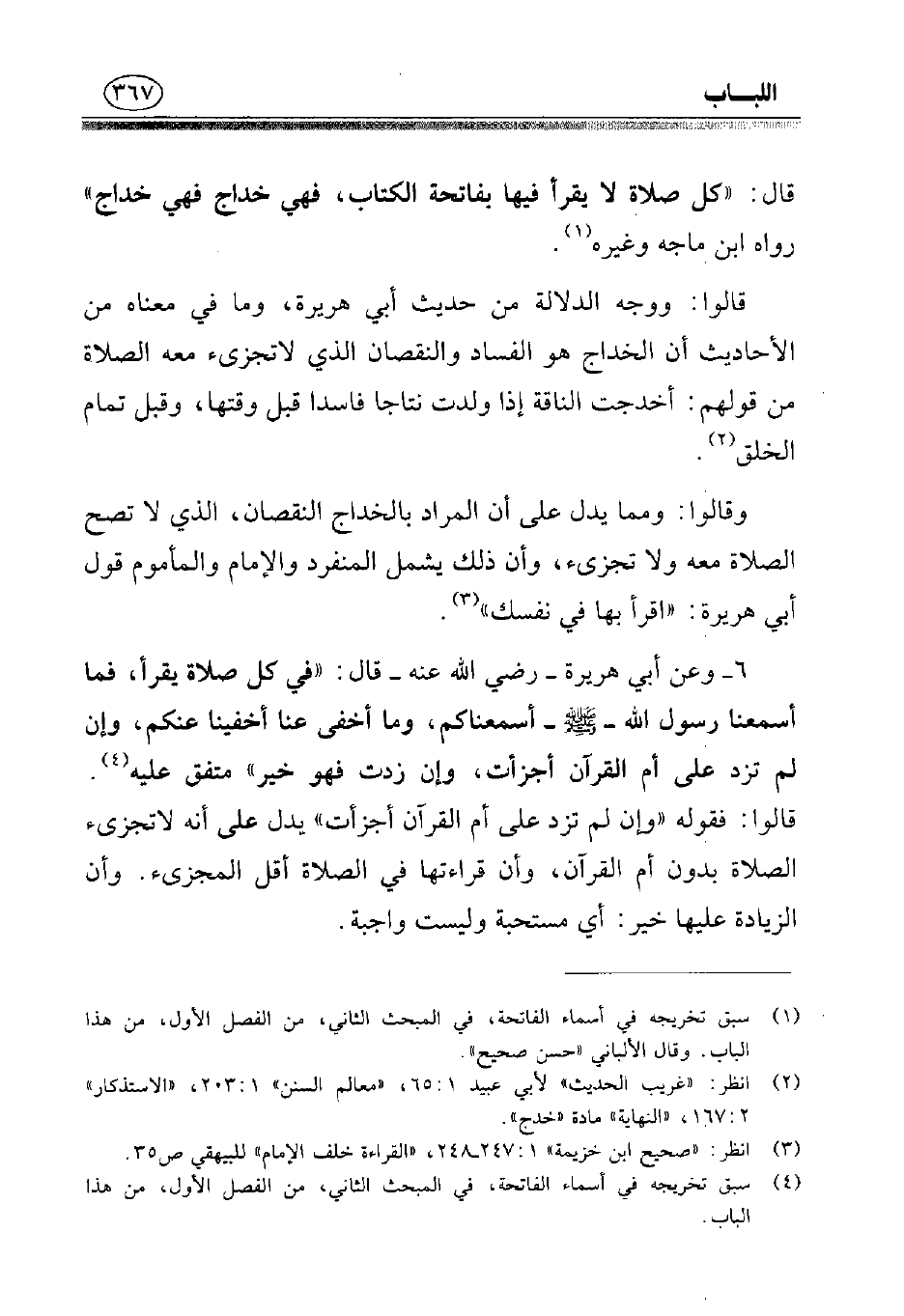 وقالوا: ومما يدل على أن المراد بالخداج النقصان، الذي لا تصح الصلاة معه ولا تجزئ، وأن ذلك يشمل المنفرد والإمام والمأموم قول أبي هريرة: «اقرأ بها في نفسك» (¬3).