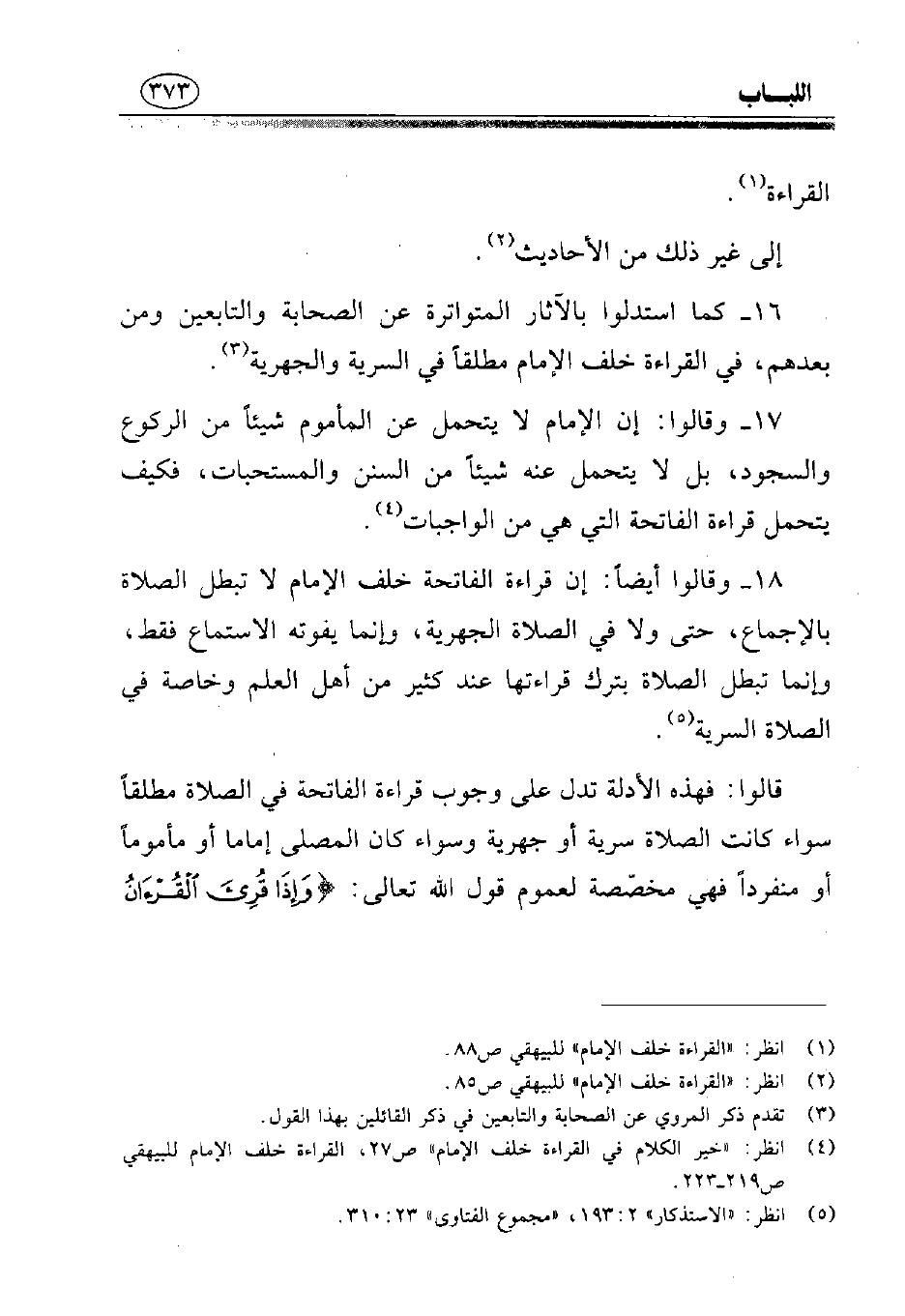 16 - كما استدلوا بالآثار المتواترة عن الصحابة والتابعين ومن بعدهم، في القراءة خلف الإمام مطلقًا في السرية والجهرية (¬3).