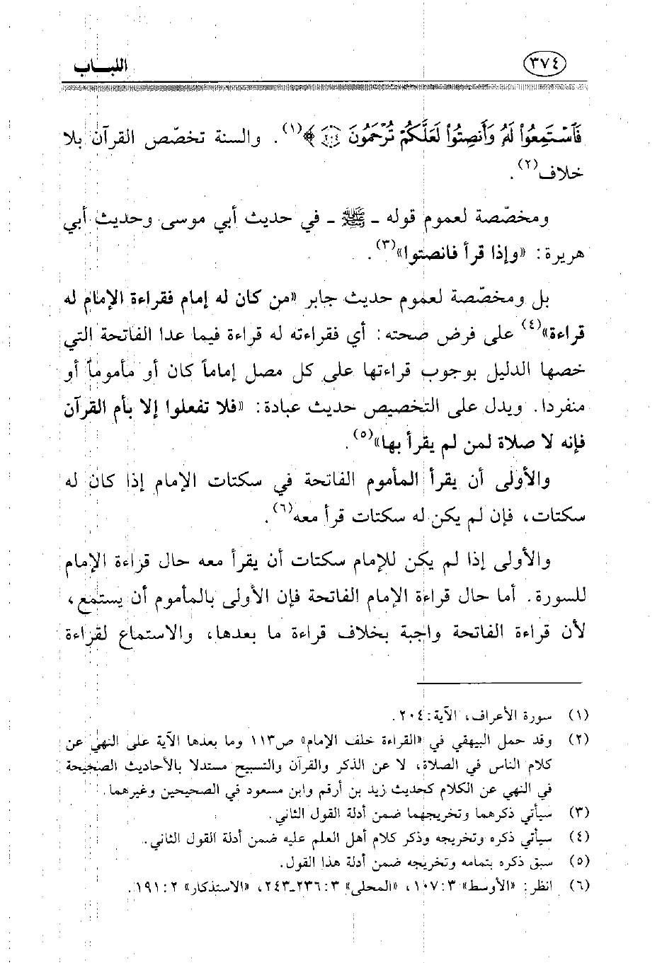 (¬2) وفد حمل البيهقي في «القراءة خلف الإمام» ص113 وما بعدها الآية على النهي عن كلام الناس في الصلاة، لا عن الذكر والقرآن والتسبيح مستدلًا بالأحاديث الصحيحة في النهي عن الكلام كحديث زيد بن أرقم وابن مسعود في الصحيحين وغيرهما.