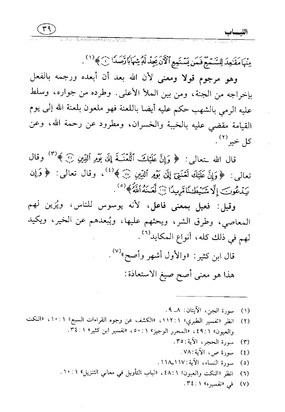 وهو مرجوم قولًا ومعنى لأن الله بعد أن أبعده ورجمه بالفعل بإخراجه من الجنة، ومن بين الملأ الأعلى. وطرده من جواره، وسلط عليه الرمي بالشهب حكم عليه أيضًا باللعنة فهو ملعون بلعنة الله إلى يوم القيامة مقضي عليه بالخيبة والخسران، ومطرود عن رحمة الله، وعن كل خير (¬2).
