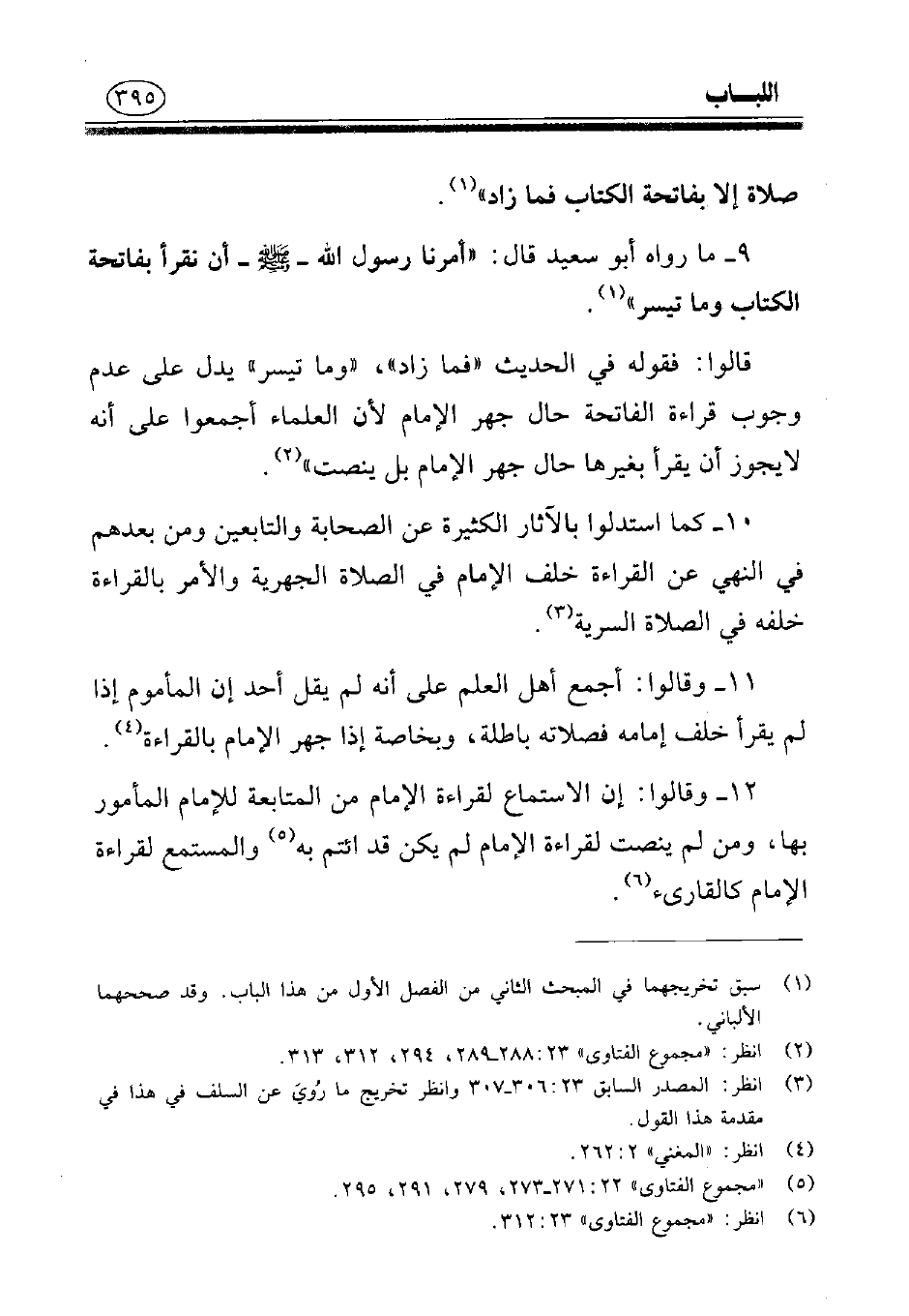 11 - وقالوا: أجمع أهل العلم على أنه لم يقل أحد إن المأموم إذا لم يقرأ خلف إمامه فصلاته باطلة، وبخاصة إذا جهر الإمام بالقراءة (¬5).