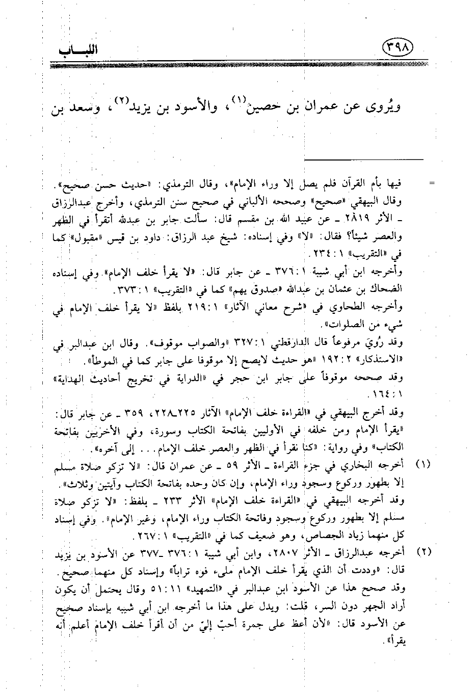 (¬1) أخرجه البخاري في جزء القراءة - الأثر 59 - عن عمران قال: «لا تزكو صلاة المسلم إلا بطهور وركوع وسجود وراء الإمام، وإن كان وحده بفاتحة الكتاب وآيتين وثلاث». وقد أخرجه البيهقي في «القراءة خلف الإمام» الأثر 233 - بلفظ: «لا تزكو صلاة مسلم إلا بطهور وركوع وسجود وفاتحة الكتاب وراء الإمام، وغير الإمام». وفي إسناد كل منهما زياد الجصاص، وهو ضعيف كما في «التقريب» 1: 267.