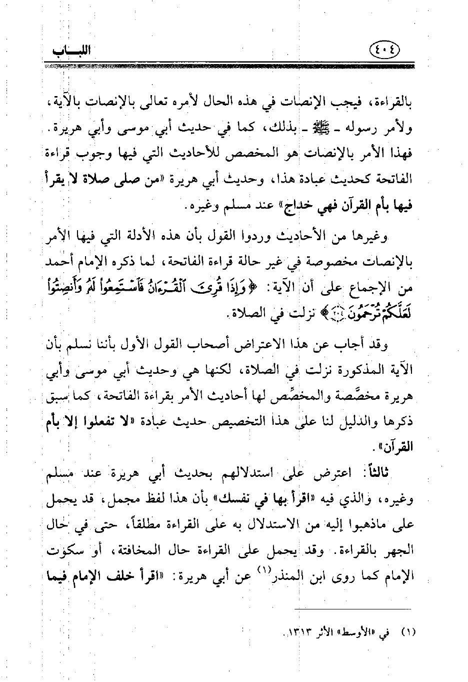 وغيرها من الأحاديث وردوا القول بأن هذه الأدلة التي فيها الأمر بالإنصات مخصوصة في غير حالة قراءة الفاتحة، لما ذكره الإمام أحمد من الإجماع على أن الآية: {وَإِذَا قُرِئَ الْقُرْآَنُ فَاسْتَمِعُوا لَهُ وَأَنْصِتُوا لَعَلَّكُمْ تُرْحَمُونَ} نزلت في الصلاة.