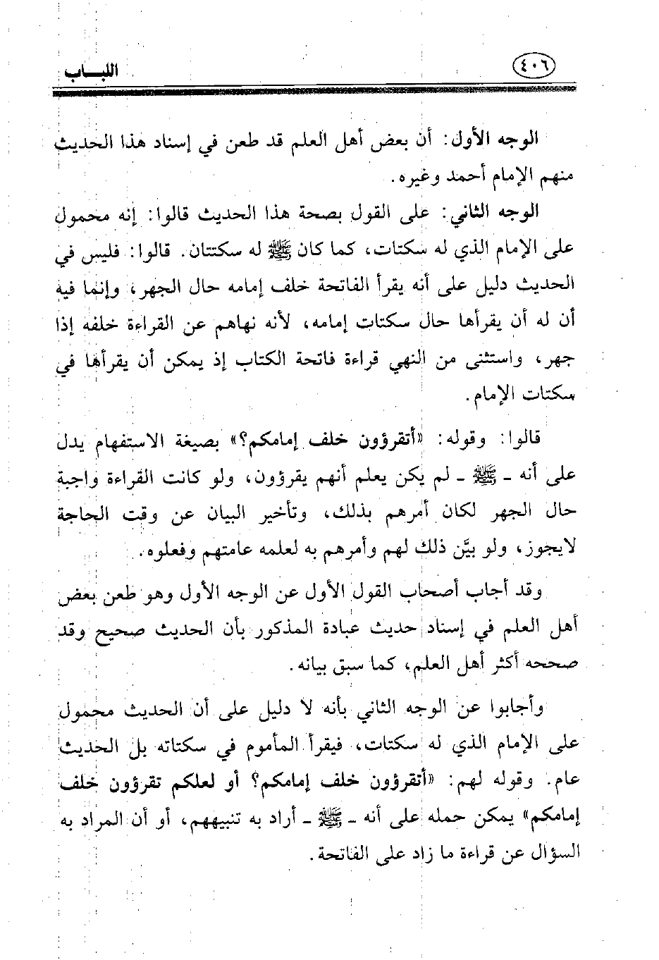 وأجابوا عن الوجه الثاني بأنه لا دليل على أن الحديث محمول على الإمام الذي له سكتات، فيقرأ المأموم في سكتاته بل الحديث عام. وقوله لهم: «أتقرؤون خلف إمامكم؟ أو لعلكم تقرؤون خلف إمامكم» يمكن حمله على أنه - صلى الله عليه وسلم - أراد به تنبيههم، أو أن المراد به السؤال عن قراءة ما زاد على الفاتحة.