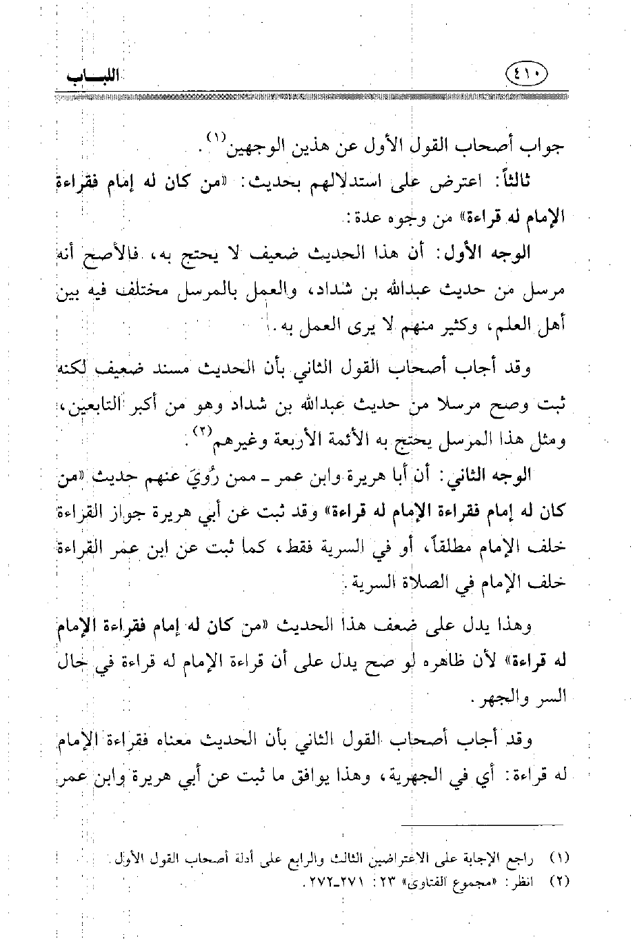 وقد أجاب أصحاب القول الثاني بأن الحديث معناه فقراءة الإمام له قراءة: أي في الجهرية، وهذا يوافق ما ثبت عن أبي هريرة وابن عمر