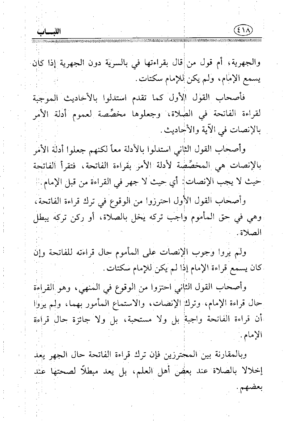 وأصحاب القول الثاني احترزوا من الوقوع في المنهي، وهو القراءة حال قراءة الإمام، وترك الإنصات، والاستماع المأمور بهما، ولم يروا أن قراءة الفاتحة واجبة بل ولا مستحبة، بل ولا جائزة حال قراءة الإمام.