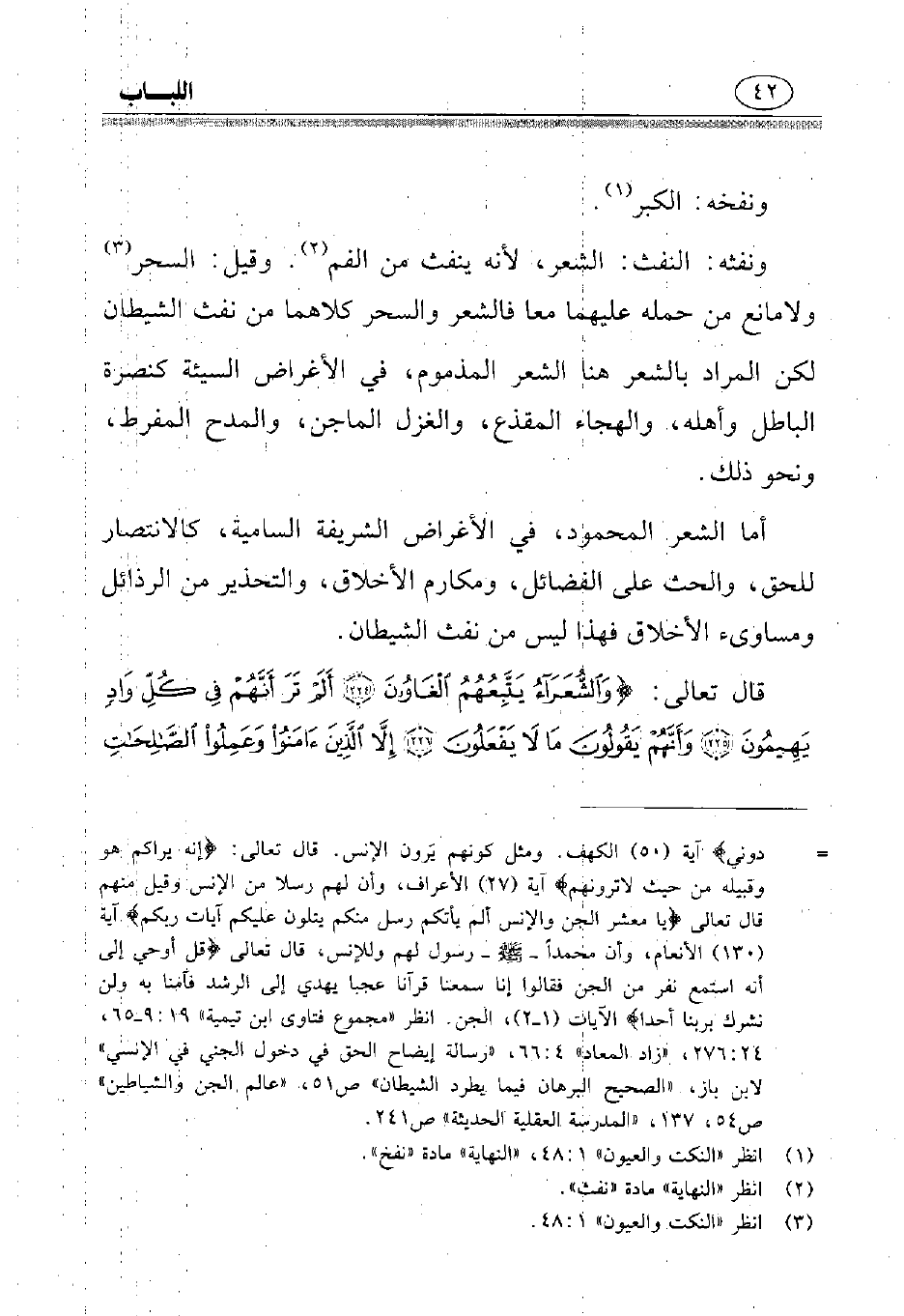 ونفثه: النفث: الشعر، لأنه ينفث من الفم (¬2). وقيل: السحر (¬3) ولا مانع من حمله عليهما معًا فالشعر والسحر كلاهما من نفث الشيطان لكن المراد بالشعر هنا الشعر المذموم، في الأغراض السيئة كنصرة الباطل وأهله، والهجاء المقذع، والغزل الماجن، والمدح المفرط، ونحو ذلك.