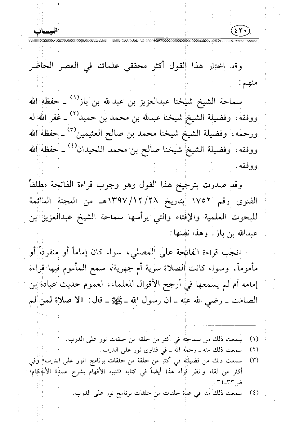 سماحة الشيخ شيخنا عبد العزيز بن عبد العزيز بن باز (¬1) - غفر الله له ورحمه، وفضيلة الشيخ شيخنا عبد الله بن محمد بن حميد (¬2) - غفر الله له ورحمه، وفضيلة الشيخ شيخنا محمد بن صالح العثيمين (¬3) - غفر الله له ورحمه، وفضيلة الشيخ شيخنا صالح بن محمد اللحيدان (¬4) - غفر الله له ورحمه.