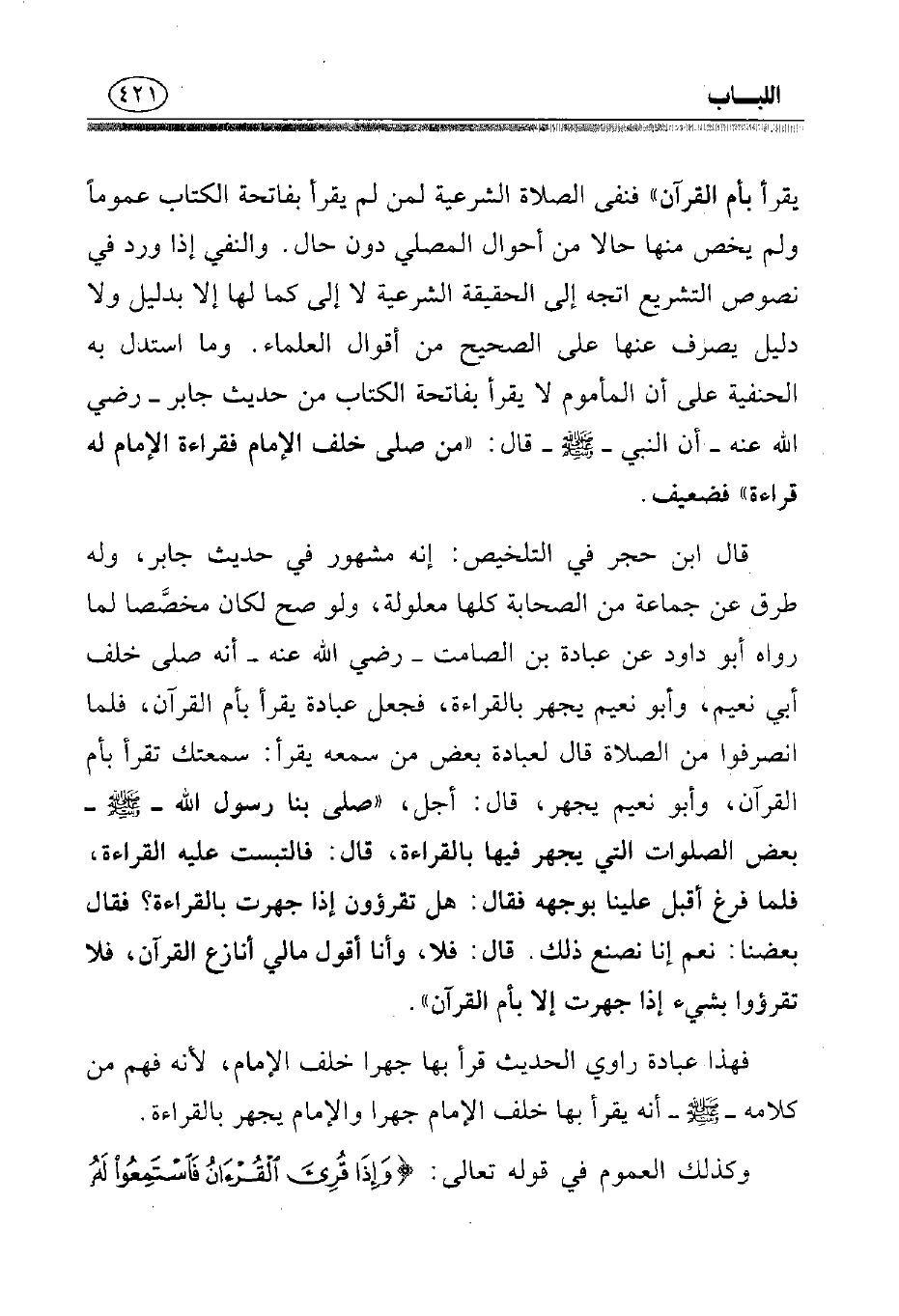 يقرأ بأم القرآن» فنفى الصلاة الشرعية لمن لم يقرأ بفاتحة الكتاب عمومًا ولم يخص منها حالا من أحوال المصلي دون حال. والنفي إذا ورد في نصوص التشريع اتجه إلى الحقيقة الشرعية لا إلى كما لها إلا بدليل ولا دليل يصرف عنها على الصحيح من أقوال العلماء. وما استدل به الحنفية على أن المأموم لا يقرأ بفاتحة الكتاب من حديث جابر - رضي الله عنه - أن النبي - صلى الله عليه وسلم - قال: «من صلى خلف الإمام فقراءة الإمام له قراءة» فضعيف.