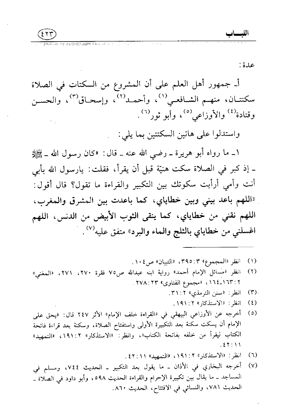 (¬7) أخرجه البخارص في الأذان- ما يقول بعد التكبير- الحديث 744، ومسلم في المساجد- ما يقال بين تكبيرة الإحرام والقراءة والحديث 598، وأبو داود في الصلاة- الحديث 781، والنسائي في الافتتاح، الحديث 860.