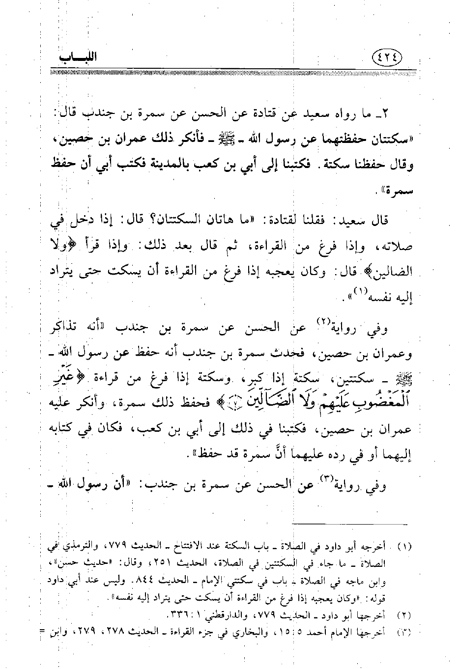 2 - ما رواه سعيد عن قتادة عن الحسن عن سمرة بن جندب قال: «سكتتان حفظتهما عن رسول الله - صلى الله عليه وسلم - فأنكر ذلك عمران بن حصين، وقال حفظنا سكتة. فكتبنا إلى أبي بن كعب بالمدينة فكتب أبي أن حفظ سمرة».