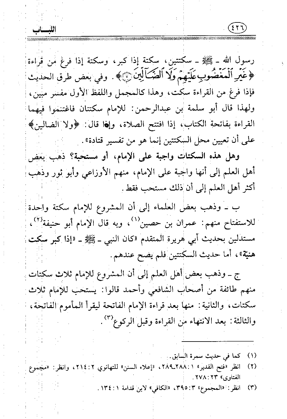 ج- وذهب بعض أهل العلم إلى أن المشروع للإمام ثلاث سكتات منهم طائفة من أصحاب الشافعي وأحمد قالوا: يستحب للإمام ثلاث سكتات، والثانية: منها بعد قراءة الإمام الفاتحة ليقرأ المأموم الفاتحة، والثالثة: بعد الانتهاء من القراءة وقبل الركوع. (¬3)