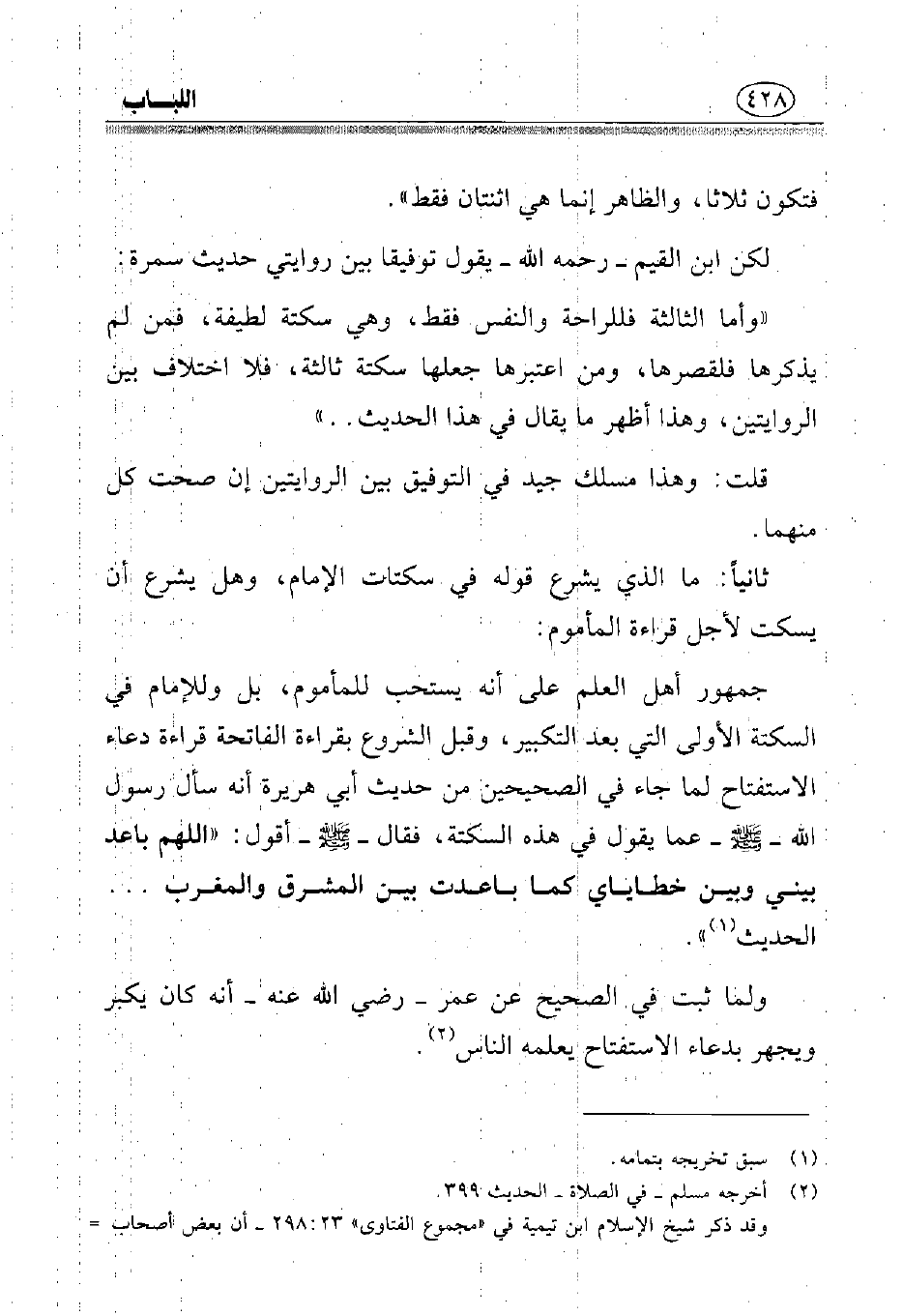 وقد ذكر شيخ الإسلام ابن تيمية في «مجموع الفتاوى» 23: 298 - أن بعض أصحاب الإمام أحمد يستحبون في حال سكوت الغمام أن يقرأ، ولا يستفتح، وهو اختيار أبي بكر الدينوري، وأبي الفرج بن الجوزي».