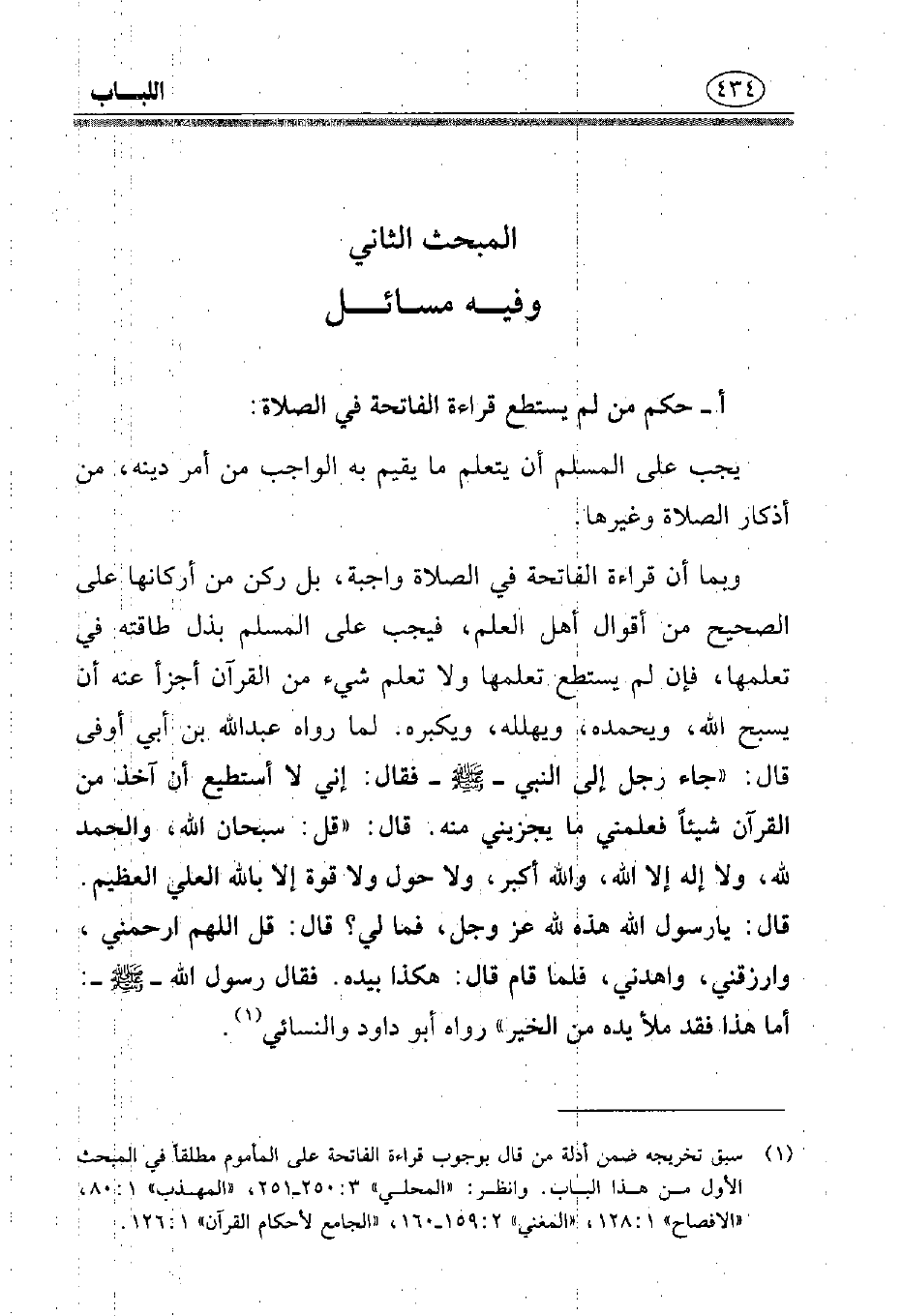 وبما أن قراءة الفاتحة في الصلاة واجبة، بل ركن من أركانها على الصحيح من أقوال أهل العلم، فيجب على المسلم بذل طاقته في تعلمها، فإن لم يستطع تعلمها ولا تعلم شيء من القرآن أجزأ عنه أن يسبح الله، ويحمده، ويهلله، ويكبره. لما رواه عبد الله بن أبي أوفى قال: «جاء رجل إلى النبي - صلى الله عليه وسلم - فقال: إني لا أستطيع أن آخذ من القرآن شيئًا فعلمني ما يجزيني منه. قال: «قل: سبحان الله، والحمد لله، ولا إله إلا الله، والله أكبر، ولا حول ولا قوة إلا بالله العلي العظيم. قال: يا رسول الله هذه لله - عز وجل -، فما لي؟ قال: قل اللهم ارحمني، وارزقني، وأهدني، فلما قام قال: هكذا بيده. فقال رسول الله - صلى الله عليه وسلم - أما هذا فقد ملأ يده من الخير» رواه أبو داود والنسائي (¬1).