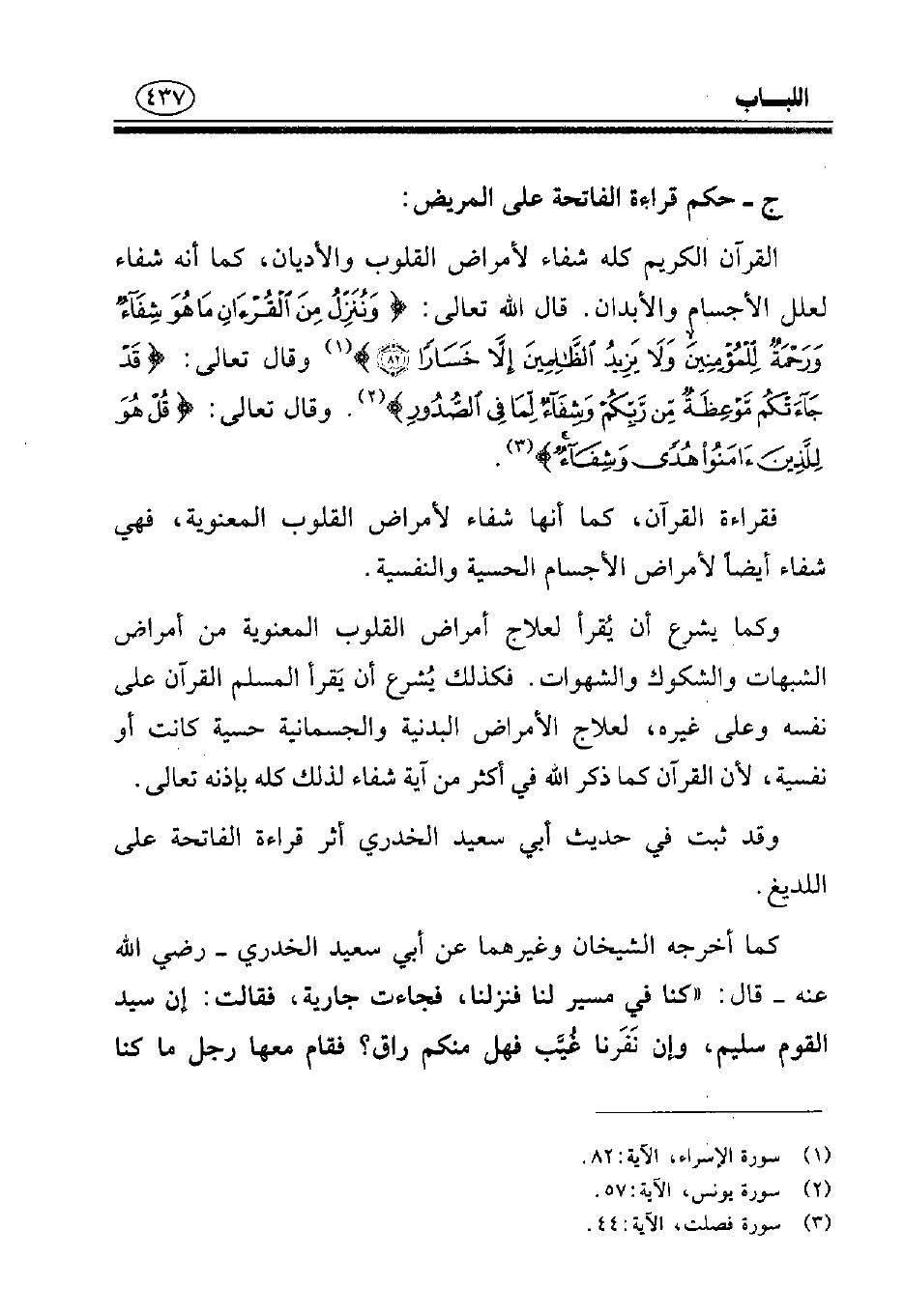 القرآن الكريم كله شفاء لأمراض القلوب والأديان، كما أنه شفاء لعلل الأجسام والأبدان. قال الله تعالى: {وَنُنَزِّلُ مِنَ الْقُرْآَنِ مَا هُوَ شِفَاءٌ وَرَحْمَةٌ لِلْمُؤْمِنِينَ وَلَا يَزِيدُ الظَّالِمِينَ إِلَّا خَسَارًا} (¬1) وقال تعالى: {قَدْ جَاءَتْكُمْ مَوْعِظَةٌ مِنْ رَبِّكُمْ وَشِفَاءٌ لِمَا فِي الصُّدُورِ} (¬2) وقال تعالى: {قُلْ هُوَ لِلَّذِينَ آَمَنُوا هُدًى وَشِفَاءٌ} (¬3).