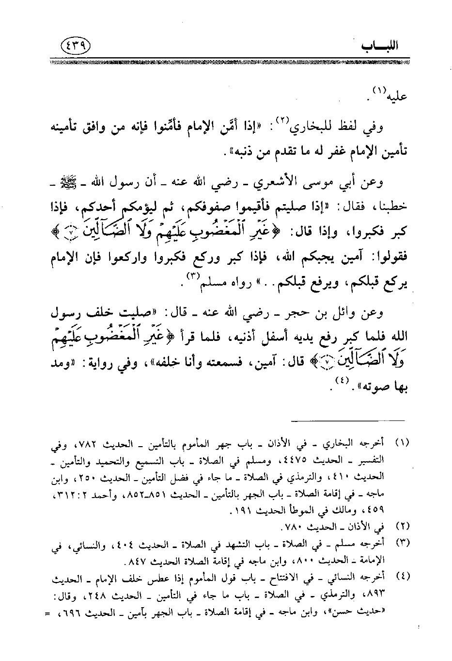 (¬4) أخرجه النسائي - في الافتتاح- باب قول المأموم إذا عطس خلف الإمام- الحديث 893، والترمذي - في الصلاة- باب ما جاء في التأمين- الحديث 248، وقال: «حديث حسن»، وابن ماجه- في إقامة الصلاة- باب الجهر بآمين- الحديث 696، وأحمد 4: 315، 316.