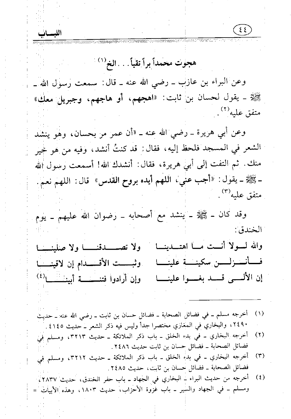 (¬3) أخرجه البخاري - في بدء الخلق - باب ذكر الملائكة - حديث (3212)، ومسلم في فضائل الصحابة _ فضائل حسان بن ثابت، حديث (2485).