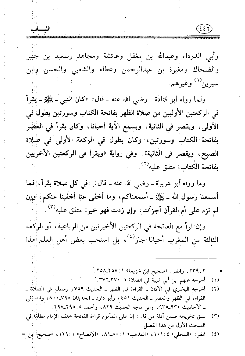 ولما رواه أبو قتادة - رضي الله عنه - قال: «كان النبي - صلى الله عليه وسلم - يقرأ في الركعتين الأوليين من صلاة الظهر بفاتحة الكتاب وسورتين يطول في الأولى، ويقصر في الثانية، ويسمع الآية أحيانا، وكان يقرأ في العصر بفاتحة الكتاب وسورتين، وكان يطول في الركعة الأولى في صلاة الصبح، ويقصر في الثانية». وفي رواية «ويقرأ في الركعتين الأخريين بفاتحة الكتاب» متفق عليه (¬2).