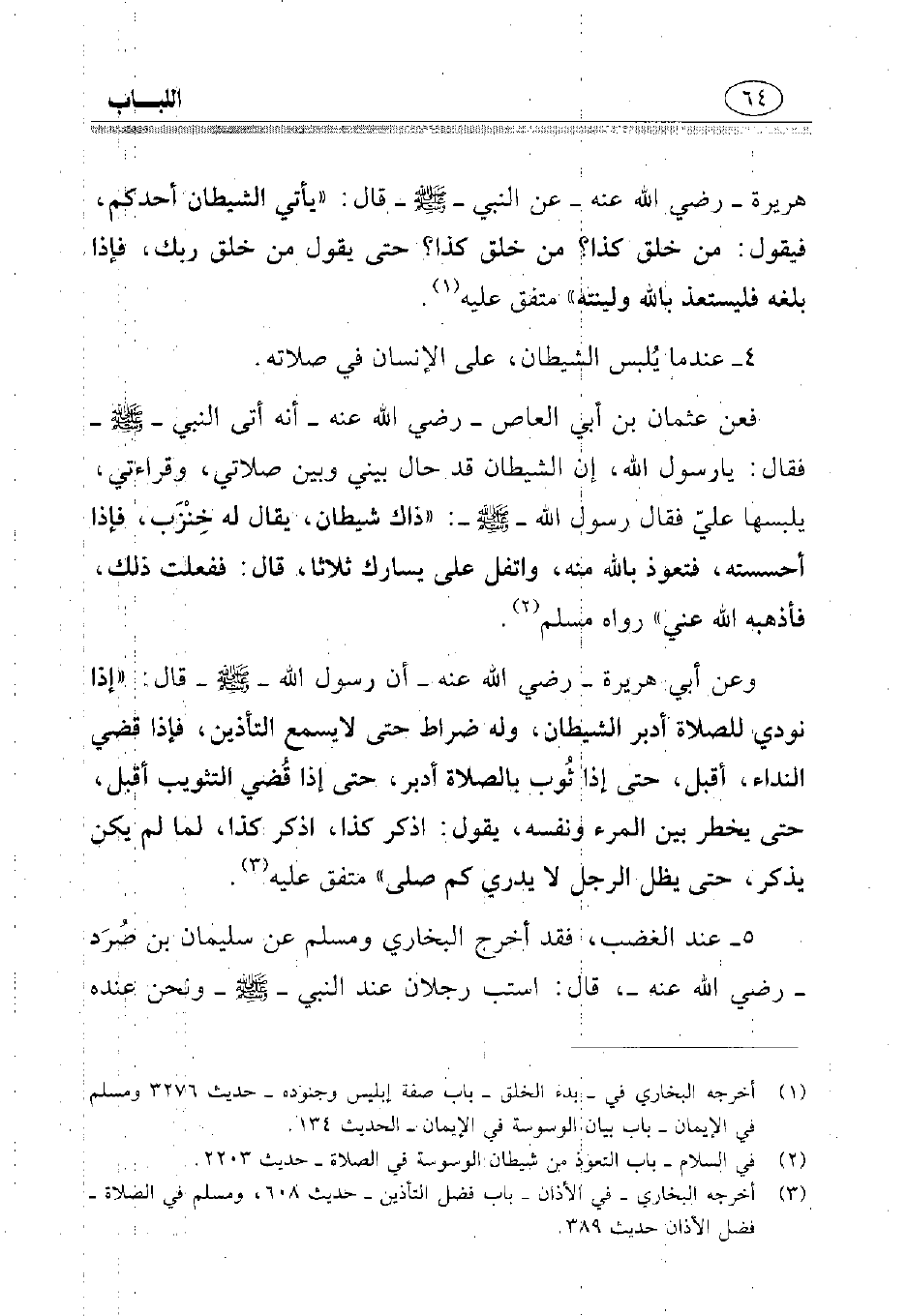 وعن أبي هريرة - رضي الله عنه - أن رسول الله - صلى الله عليه وسلم - قال: «إذا نودي للصلاة أدبر الشيطان، وله ضراط حتى لايسمع التأذين، فإذا قضي الندا، أقبل، حتى إذا ثوب بالصلاة أدبر، حتى إذا قضي التثويب أقبل، حتى يخطر بين المرء فى نفسه، يقول: اذكر كذا، اذكر كذا، لما لم يكن يذكر، حتى يظل الرجل لا يدري كم صلى»، متفق عليه (¬3).
