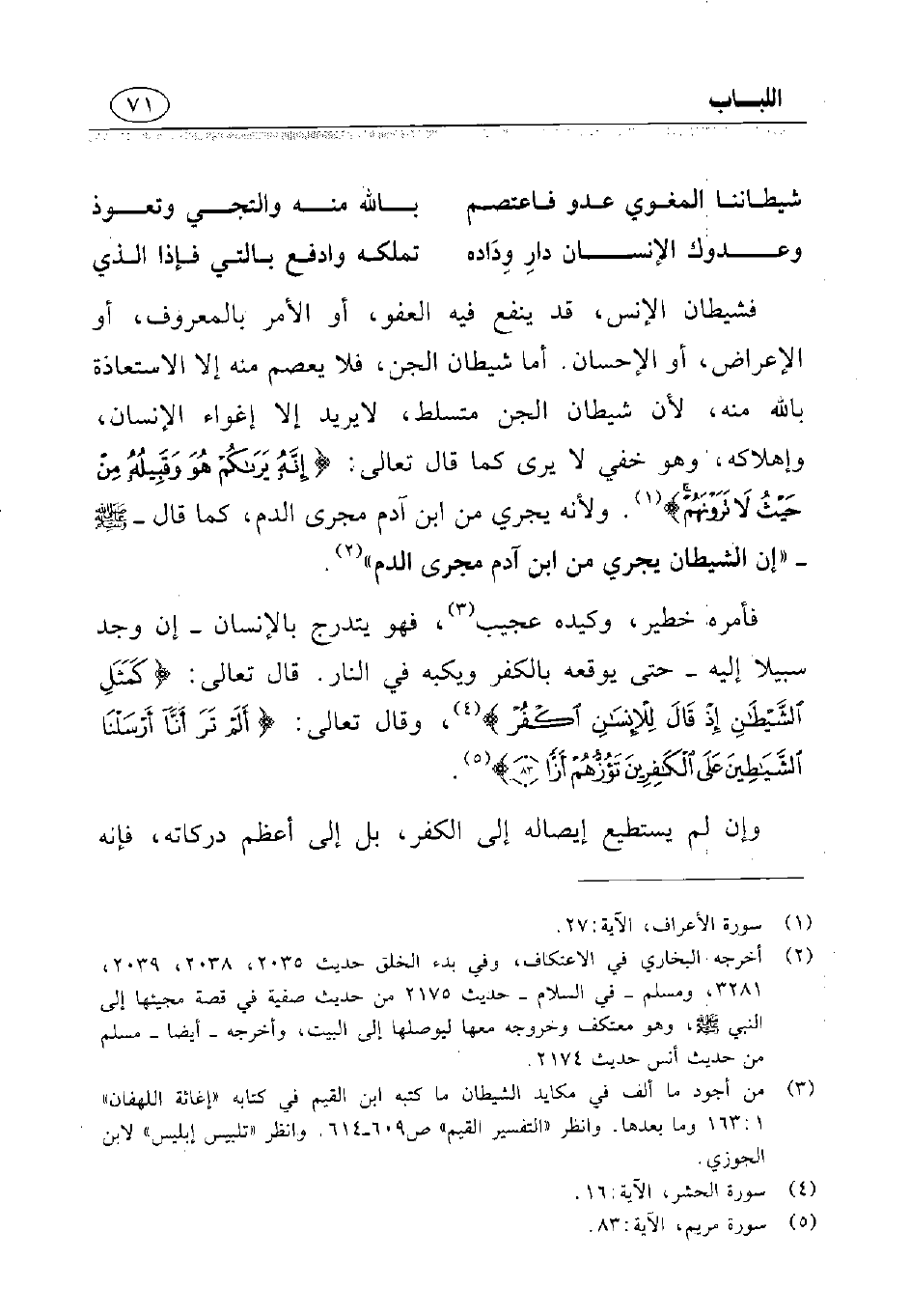 (¬3) من أجود ما ألف في مكايد الشيطان ما كتبه ابن القيم في كتابه «إغاثة اللهفان» 1: 163 وما بعدها. وانظر «التفسير القيم» ص 609 - 614. وانظر «تلبيس إبليس» لابن الجوزي.