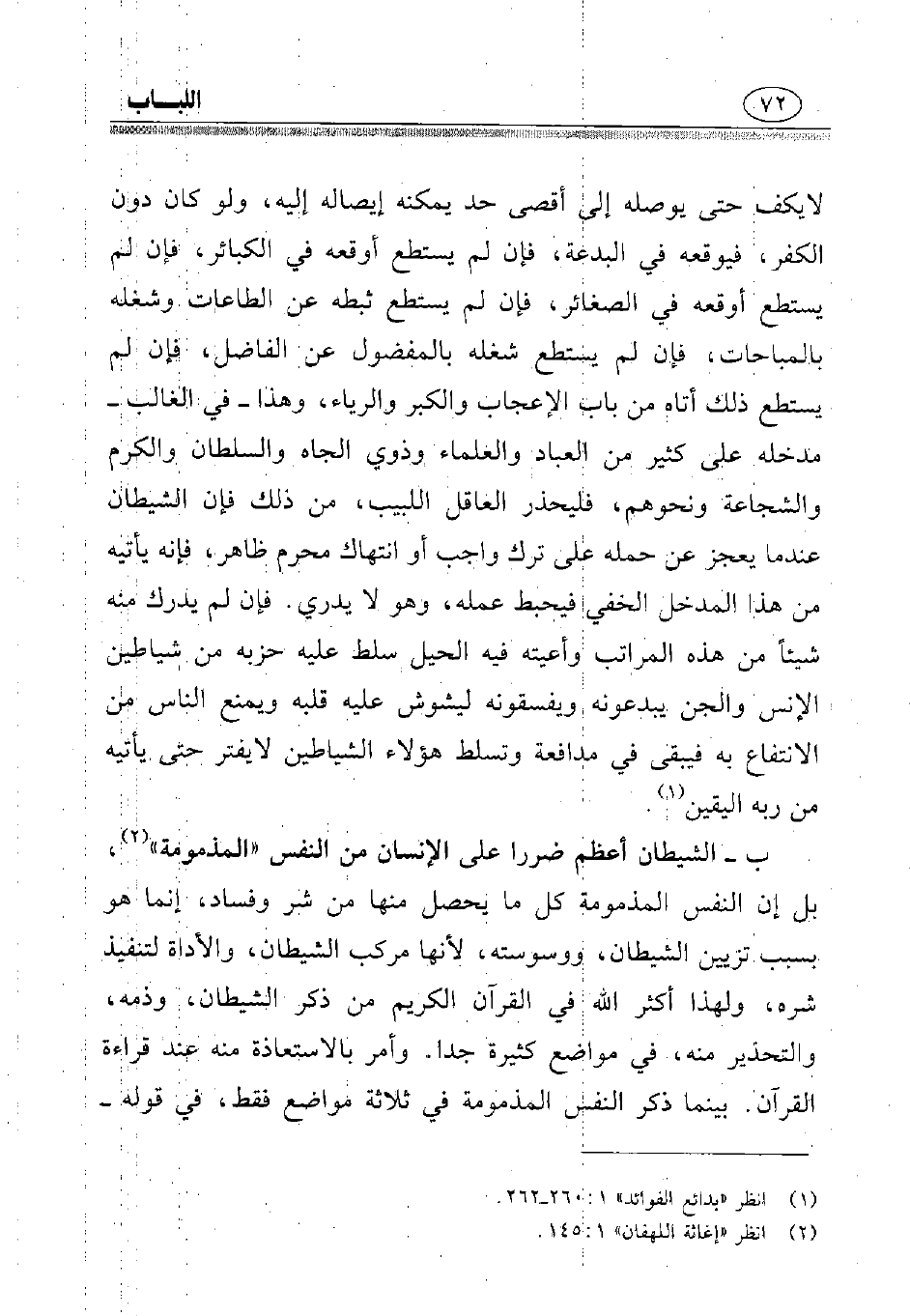 ب- الشيطان أعظم ضررًا على الإنسان من النفس «المذمومة» (¬2)، بل إن النفس المذمومة كل ما يحصل منها من شر وفساد، إنما هو بسبب تزيين الشيطان، ووسوسته، لأنها مركب الشيطان، والأداة لتنفيذ شره، ولهذا أكثر الله في القرآن الكريم من ذكر الشيطان، وذمه، والتحذير منه، في مواضع كثيرة جدًا. وأمر بالاستعاذة منه عند قراءة القرآن. بينما ذكر النفس المذمومة في ثلاثة مواضع فقط، في قوله -