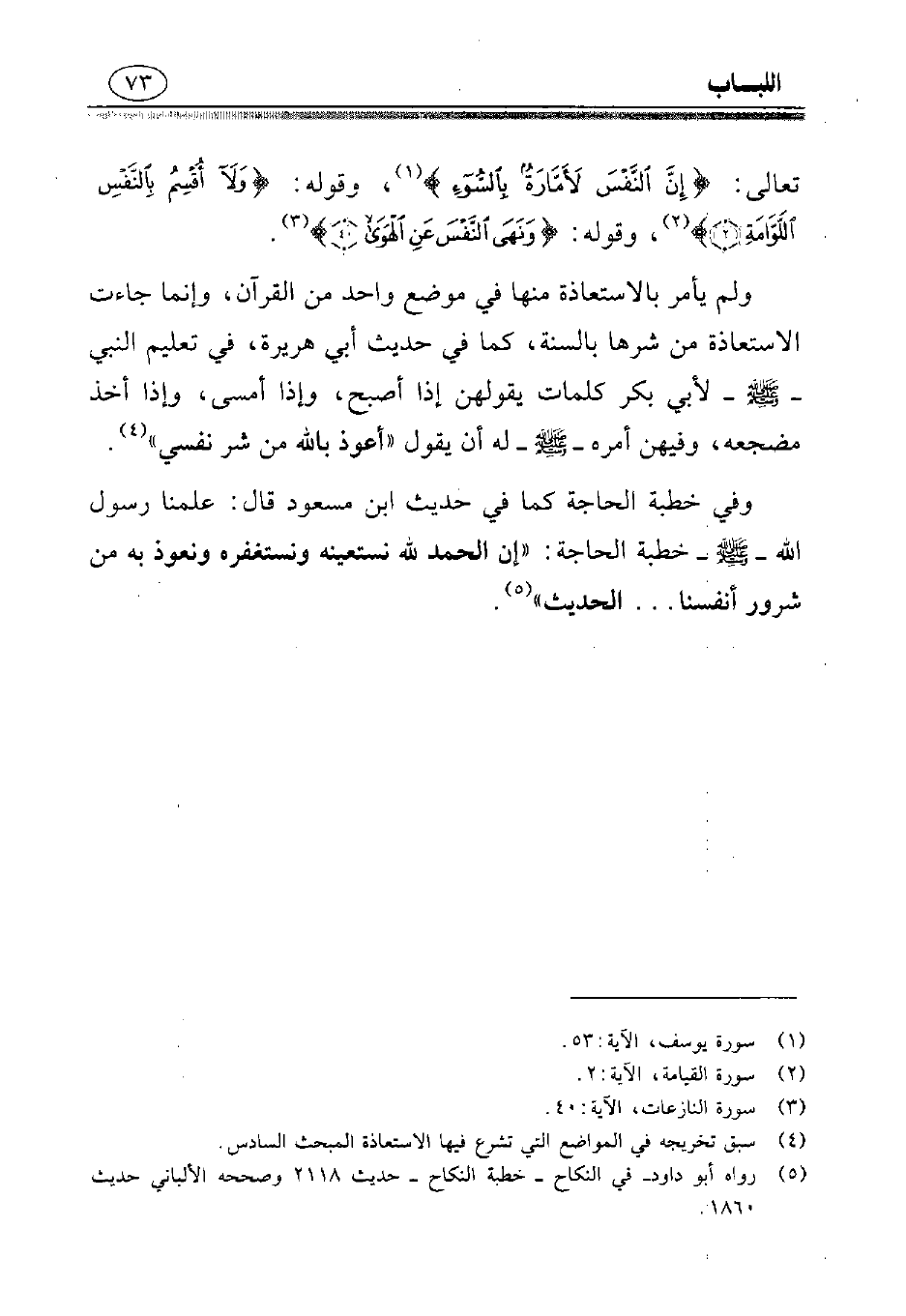 وفي خطبة الحاجة كما في حديث ابن مسعود قال: علمنا رسول الله - صلى الله عليه وسلم - خطبة الحاجة: «إن الحمه لله نستعينه ونستغفره ونعوذ به من شرور أنفسنا ... الحديث» (¬5).