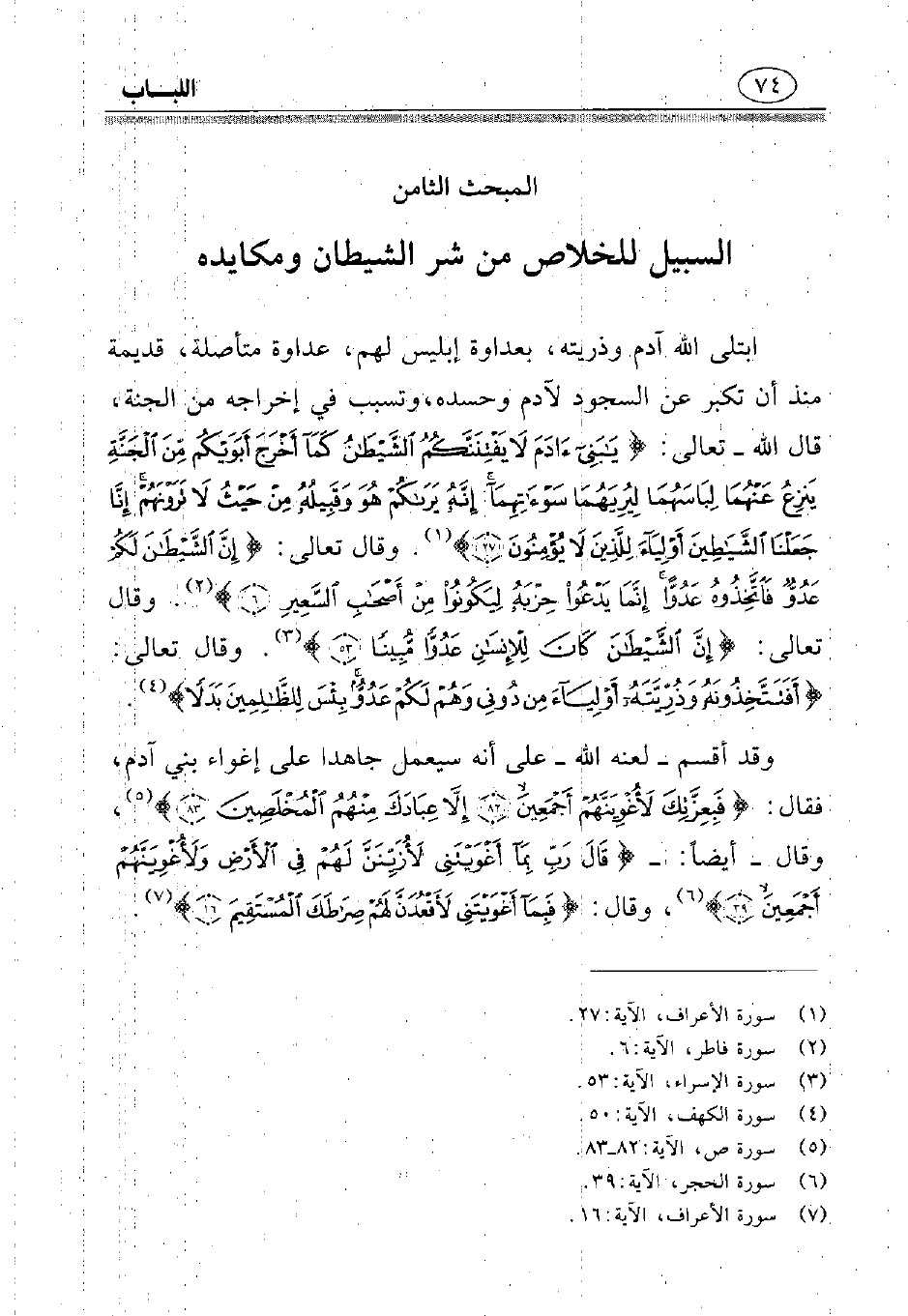 ابتلى الله آدم وذريته، بعداوة إبليس لهم، عداوة متأصلة، قديمة منذ أن تكبر عن السجود لآدم وحسده، وتسبب في إخراجه من الجنة، قال الله - تعالى: {يَا بَنِي آَدَمَ لَا يَفْتِنَنَّكُمُ الشَّيْطَانُ كَمَا أَخْرَجَ أَبَوَيْكُمْ مِنَ الْجَنَّةِ يَنْزِعُ عَنْهُمَا لِبَاسَهُمَا لِيُرِيَهُمَا سَوْآَتِهِمَا إِنَّهُ يَرَاكُمْ هُوَ وَقَبِيلُهُ مِنْ حَيْثُ لَا تَرَوْنَهُمْ إِنَّا جَعَلْنَا الشَّيَاطِينَ أَوْلِيَاءَ لِلَّذِينَ لَا يُؤْمِنُونَ (27)} (¬1). وقال تعالى: {إِنَّ الشَّيْطَانَ لَكُمْ عَدُوٌّ فَاتَّخِذُوهُ عَدُوًّا إِنَّمَا يَدْعُو حِزْبَهُ لِيَكُونُوا مِنْ أَصْحَابِ السَّعِيرِ (6)} (¬2). وقال تعالى: {إِنَّ الشَّيْطَانَ كَانَ لِلْإِنْسَانِ عَدُوًّا مُبِينًا (53)} (¬3). وقال تعالى: {أَفَتَتَّخِذُونَهُ وَذُرِّيَّتَهُ أَوْلِيَاءَ مِنْ دُونِي وَهُمْ لَكُمْ عَدُوٌّ بِئْسَ لِلظَّالِمِينَ بَدَلًا (50)} (¬4).