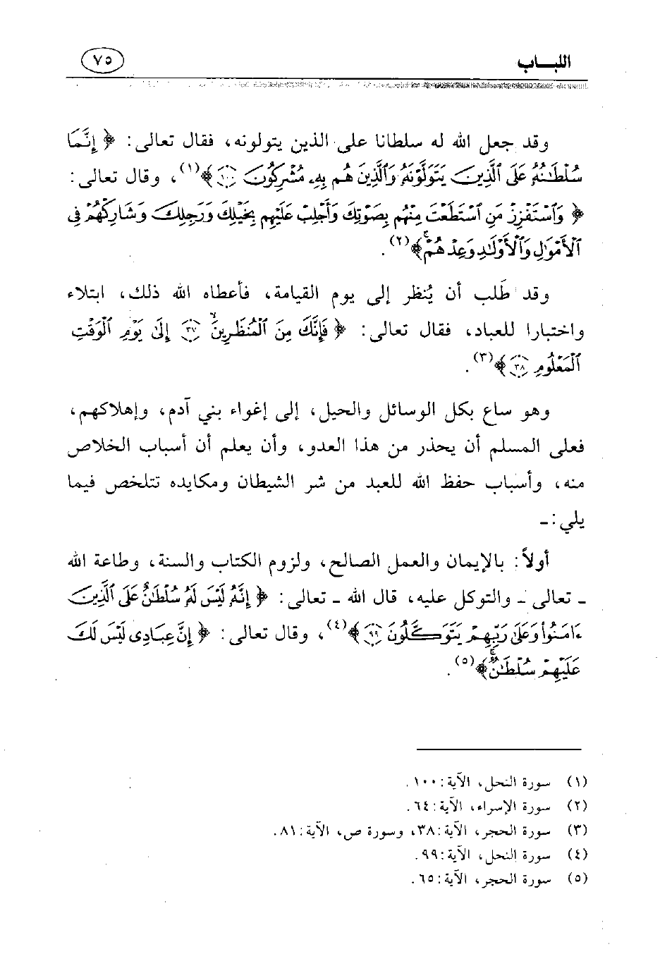 أولًا: بالإيمان والعمل الصالح، ولزوم الكتاب والسنة، وطاعة الله - تعالى - والتوكل عليه، قال الله - تعالى: {إِنَّهُ لَيْسَ لَهُ سُلْطَانٌ عَلَى الَّذِينَ آَمَنُوا وَعَلَى رَبِّهِمْ يَتَوَكَّلُونَ (99)} (¬4)، وقال تعالى: {إِنَّ عِبَادِي لَيْسَ لَكَ عَلَيْهِمْ سُلْطَانٌ} (¬5).