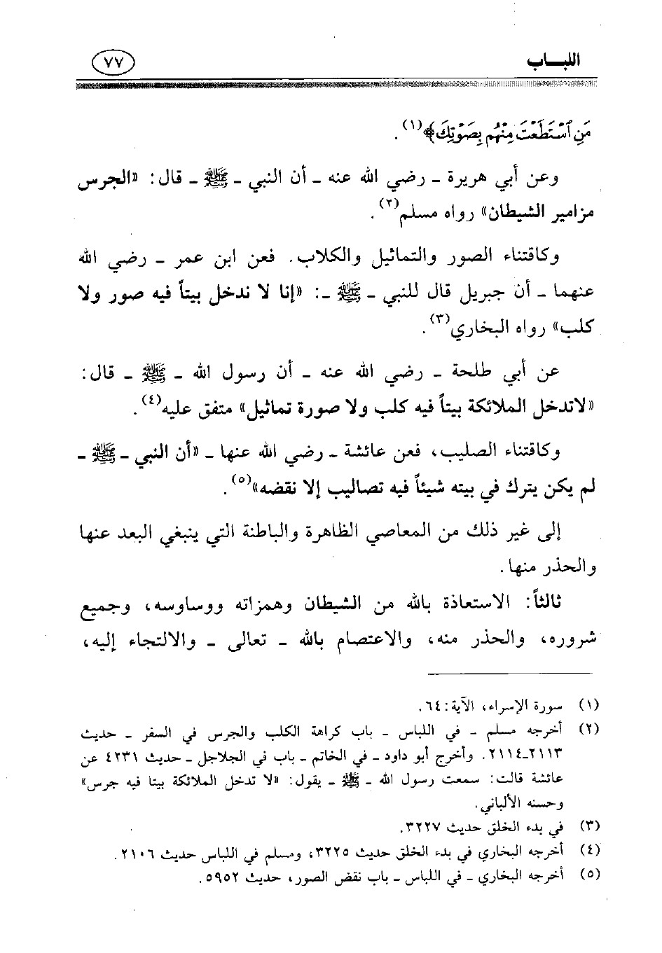 عن أبي طلحة - رضي الله عنه - أن رسول الله - صلى الله عليه وسلم - قال: «لا تدخل الملائكة بيتًا فيه كلب ولا صورة تماثيل» متفق عليه (¬4).