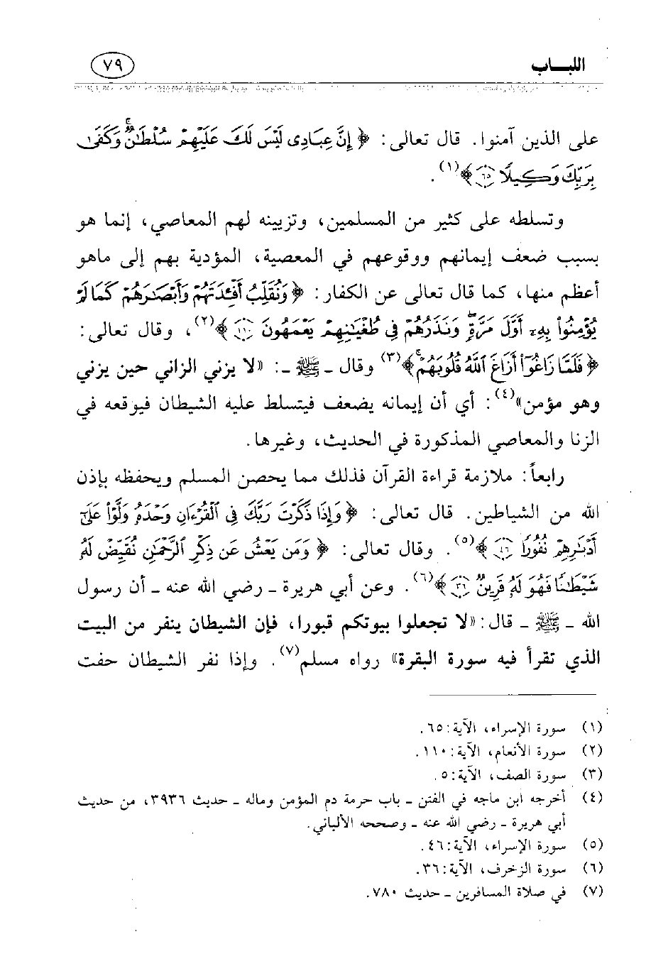 وتسلطه على كثير من المسلمين، وتزيينه لهم المعاصى، إنما هو بسبب ضعف إيمانهم ووقوعهم فى المعصية، المؤدية بهم إلى ما هو أعظم منها، كما قال تعالى عن الكفار: {وَنُقَلِّبُ أَفْئِدَتَهُمْ وَأَبْصَارَهُمْ كَمَا لَمْ يُؤْمِنُوا بِهِ أَوَّلَ مَرَّةٍ وَنَذَرُهُمْ فِي طُغْيَانِهِمْ يَعْمَهُونَ (110)} (¬2)، وقال تعالى: {فَلَمَّا زَاغُوا أَزَاغَ اللَّهُ قُلُوبَهُمْ} (¬3) وقال - صلى الله عليه وسلم -: «لا يزني الزاني حين يزني وهو مؤمن» (¬4): أى أن إيمانه يضعف فيتسلط عليه الشيطان فيوقعه فى الزنا والمعاصي المذكورة فى الحديث، وغيرها.