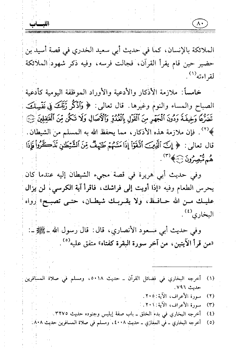 خامسًا: ملازمة الأذكار والأدعية والأوراد الموظفة اليومية كأدعية الصباح والمساء والنوم وغيرها. قال تعالى: {وَاذْكُرْ رَبَّكَ فِي نَفْسِكَ تَضَرُّعًا وَخِيفَةً وَدُونَ الْجَهْرِ مِنَ الْقَوْلِ بِالْغُدُوِّ وَالْآَصَالِ وَلَا تَكُنْ مِنَ الْغَافِلِينَ (205)} (¬2). فإن ملازمة هذه الأذكار، مما يحفظ الله به المسلم من الشيطان. قال تعالى: {إِنَّ الَّذِينَ اتَّقَوْا إِذَا مَسَّهُمْ طَائِفٌ مِنَ الشَّيْطَانِ تَذَكَّرُوا فَإِذَا هُمْ مُبْصِرُونَ (201)} (¬3).