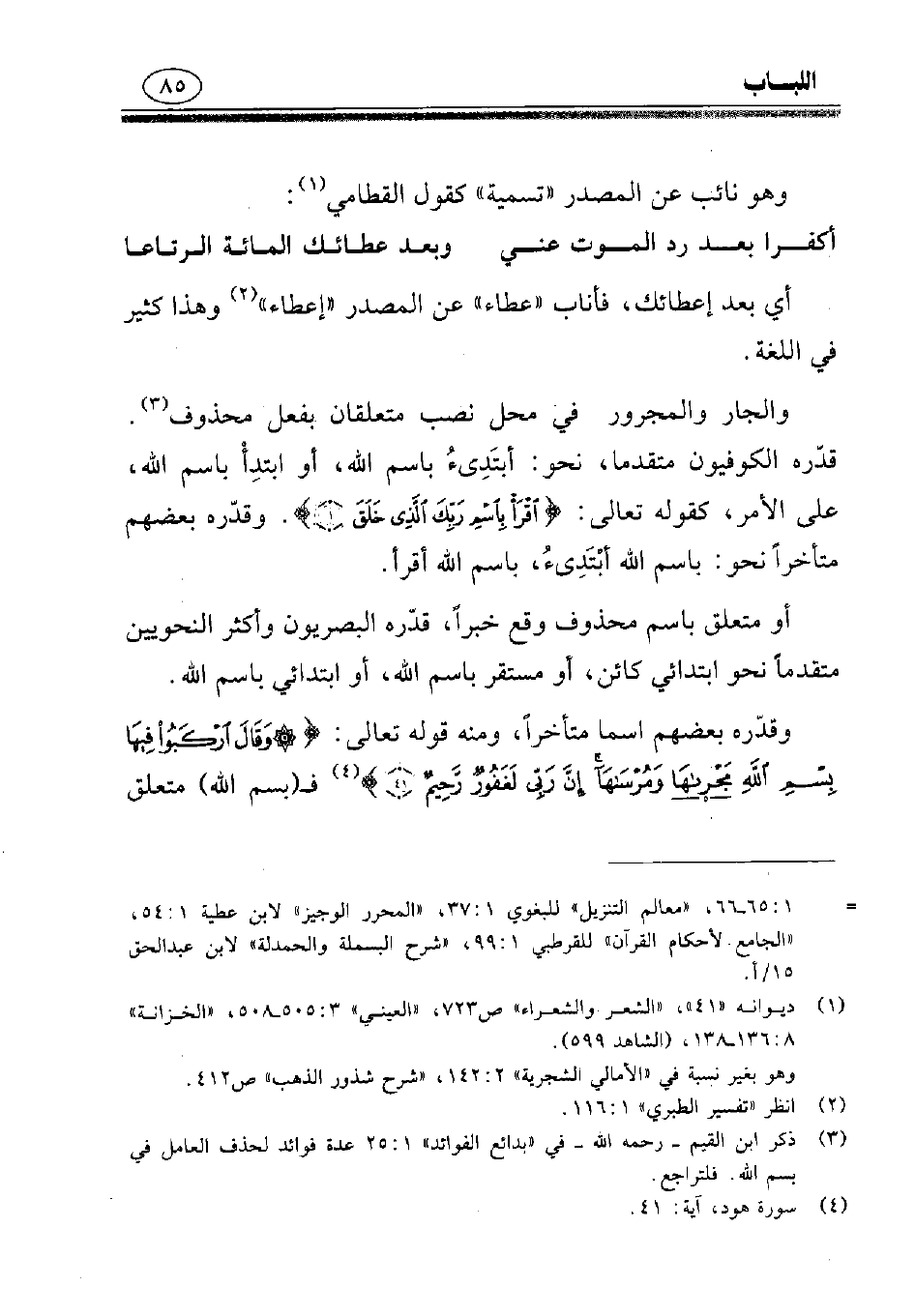(¬3) ذكر ابن القيم - رحمه الله - في «بدائع الفوائد» 1: 25 عدة فوائد لحذف العامل في بسم الله. فلتراجع.