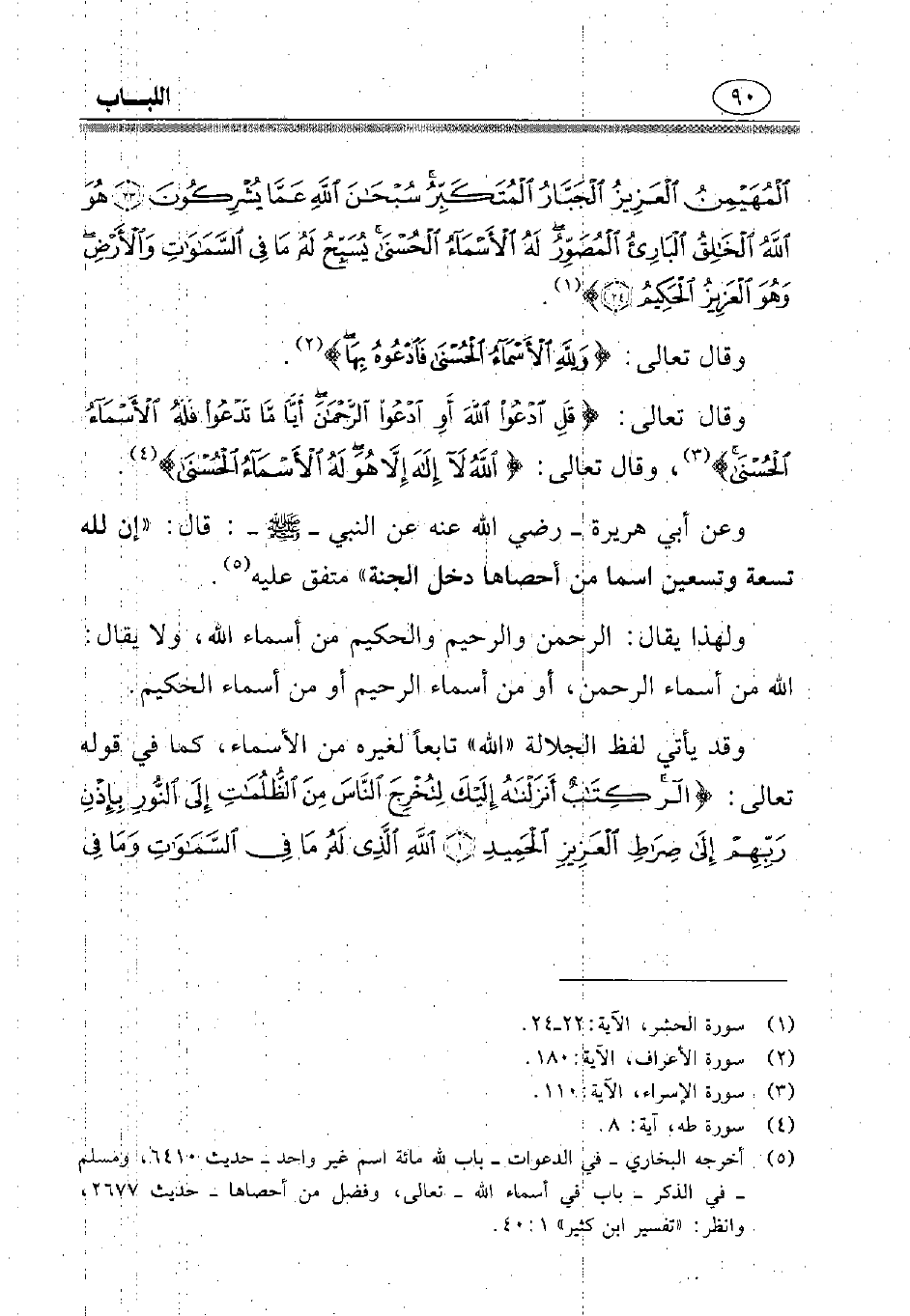 (¬5) أخرجه البخاري - في الدعوات - باب لله مائة اسم غير واحد - حديث 6410، ومسلم - في الذكر - باب في أسماء الله - تعالى، وفضل من أحصاها - حديث 2677، وانظر: «تفسير ابن كثير» 1: 40.