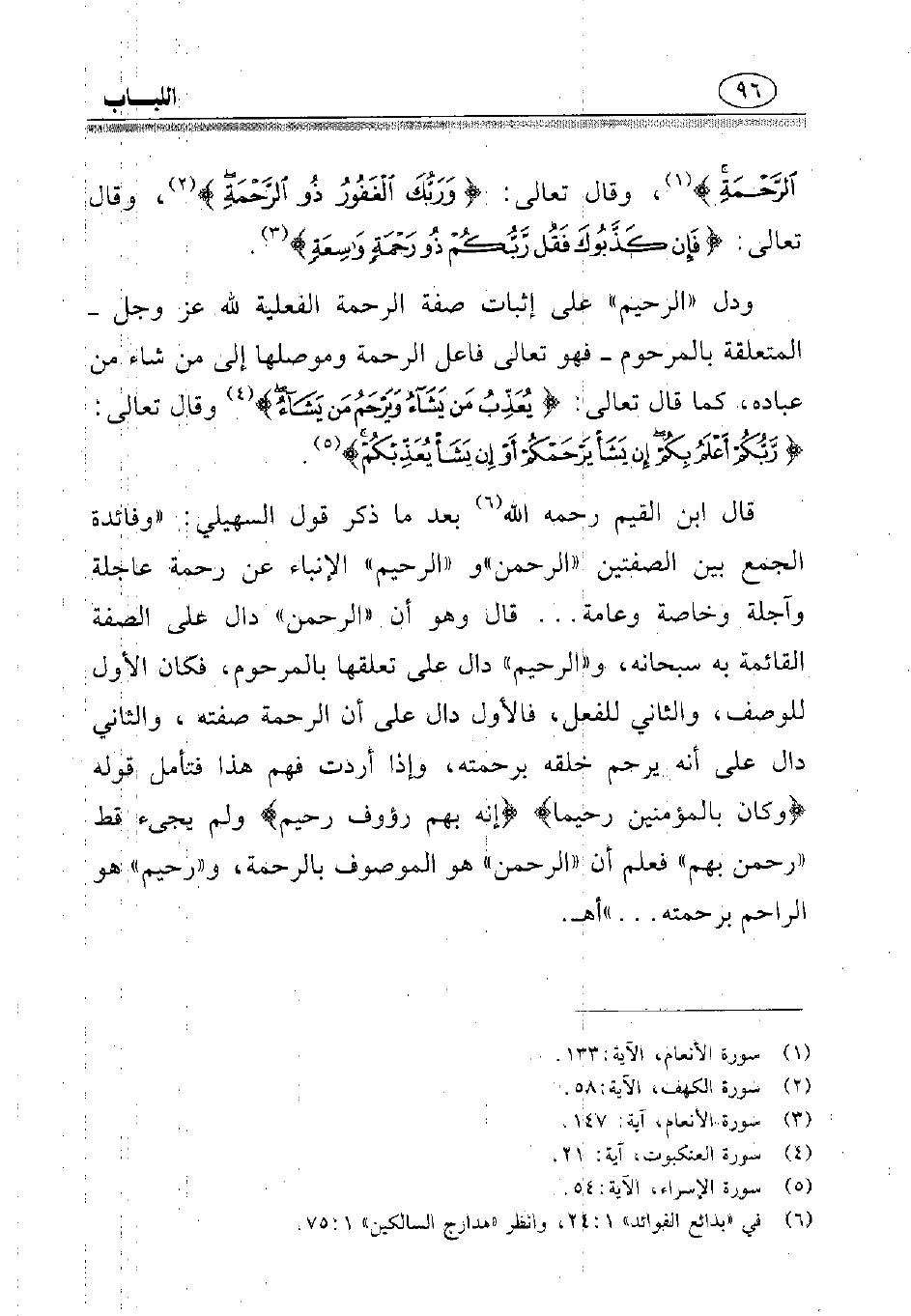 قال ابن القيم رحمه الله (¬6) بعد ما ذكر قول السهيلي: «فائدة الجمع بين الصفتين «الرحمن» و «الرحيم» الإنباء عن رحمة عاجلة وآجلة فى خاصة وعامة ... قال وهو أن «الرحمن» دال على الصفة القائمة به سبحانه، و «الرحيم» دال على تعلقها بالمرحوم، فكان الأول للوصف، والثاني للفعل، فالأول دال على أن الرحمة صفته، والثاني دال على أنه يرحم خلقه برحمته، وإذا أردت فهم هذا فتأمل قوله {وَكَانَ بِالْمُؤْمِنِينَ رَحِيمًا} {إِنَّهُ بِهِمْ رَءُوفٌ رَحِيمٌ} ولم يجيء قط «رحمن بهم» فعلم أن «الرحمن» هو الموصوف بالرحمة، و «رحيم» هو الراحم برحمته ....» أهـ.