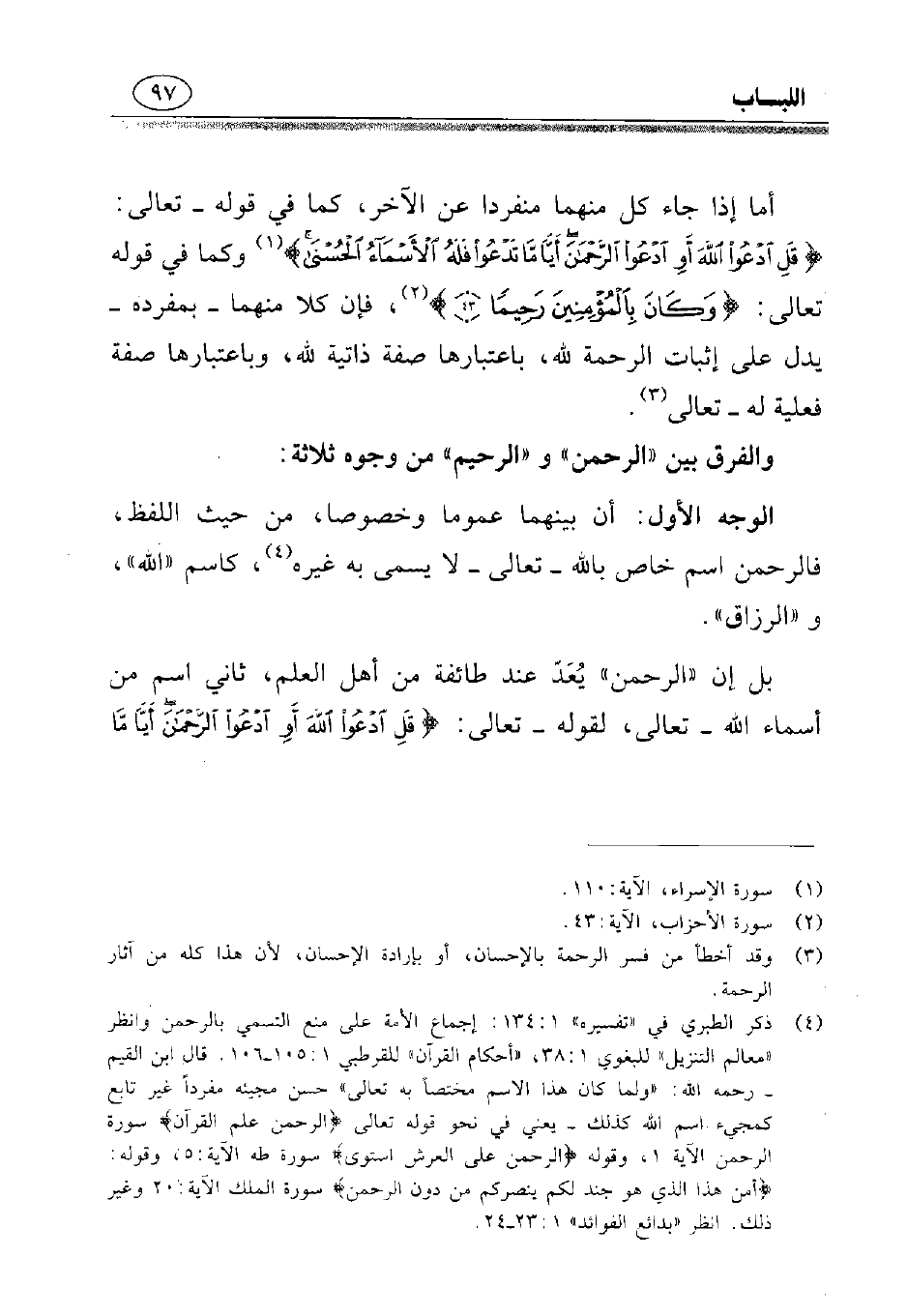 (¬4) ذكر الطبري في «تفسيره» 1: 134: إجماع الأمة على منع التسمي بالرحمة وانظر «معالم التنزيل» للبغوي 1: 38، «أحكام القرآن» للقرطبي 1: 105 - 106. قال ابن القيم - رحمه الله: «ولما كان هذا الاسم مختصًا به تعالى» حسن مجيئه مفرًا غير تابع كمجئ اسم الله كذلك - يعني في نحو قوله تعالى {الرَّحْمَنُ (1) عَلَّمَ الْقُرْآَنَ} سورة الرحمن الآية 1، وقوله {الرَّحْمَنُ عَلَى الْعَرْشِ اسْتَوَى} سورة طه الآية: 5، وقوله: {أَمَّنْ هَذَا الَّذِي هُوَ جُنْدٌ لَكُمْ يَنْصُرُكُمْ مِنْ دُونِ الرَّحْمَنِ} سورة الملك الآية: 20 وغير ذلك. انظر «بدائع الفوائد» 1: 23 - 24.